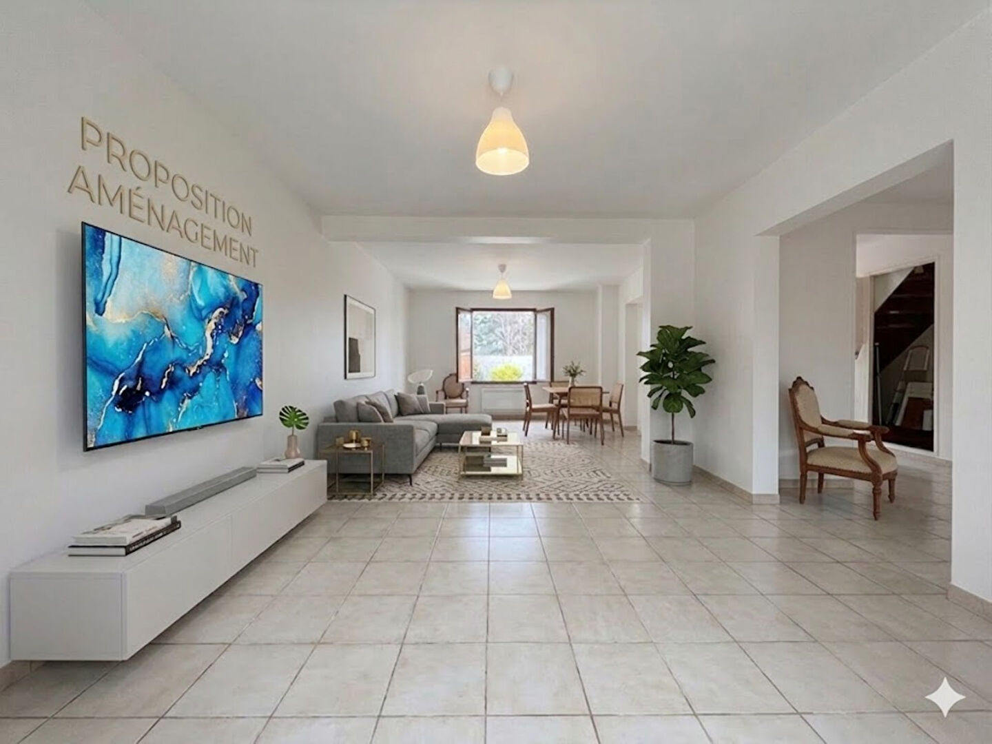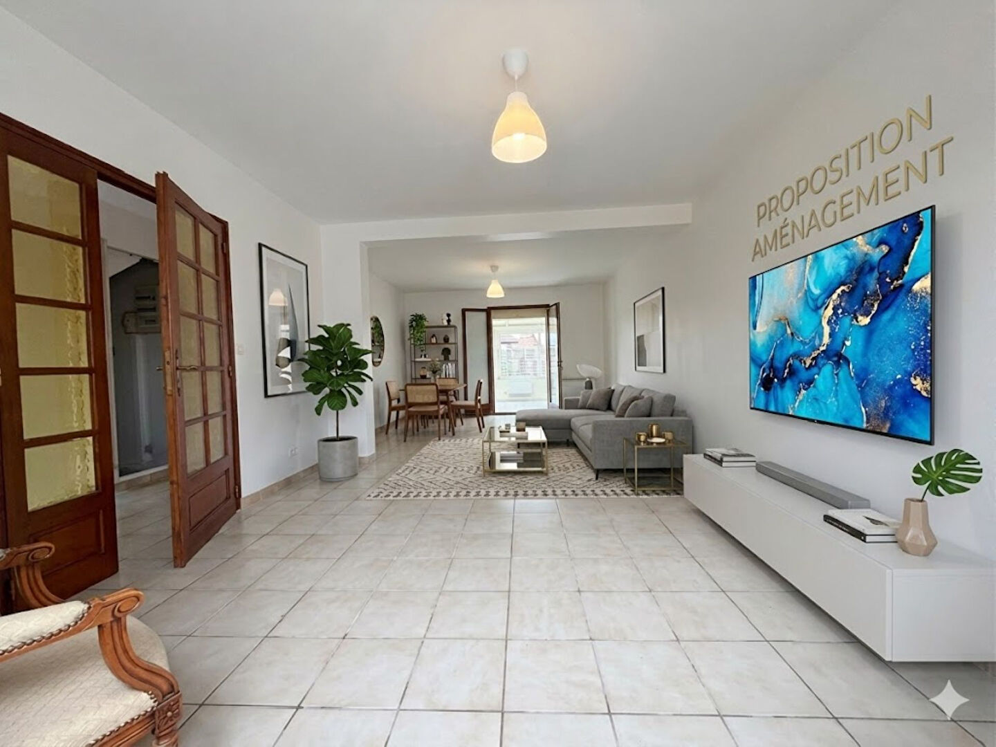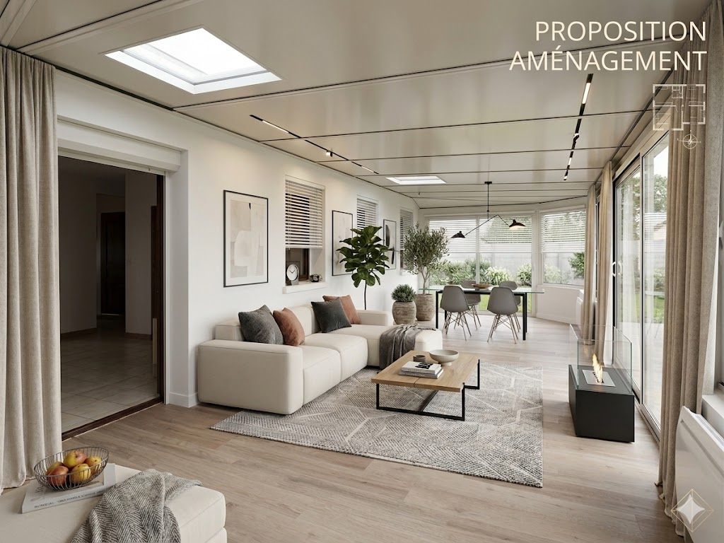 Pièce de vie de 32 m² donnant sur sa véranda de 30 m² .