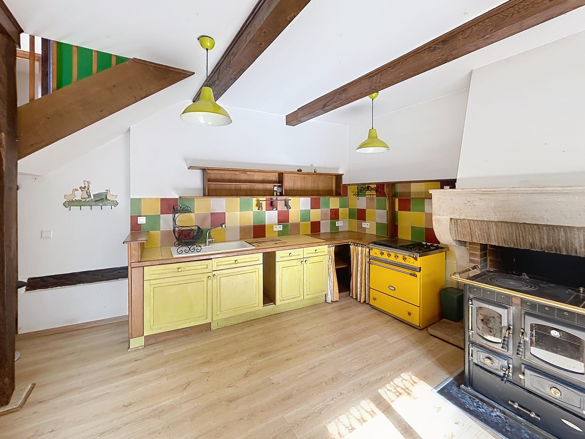 o Cuisine chaleureuse de 28 m2 avec cheminée lorraine et cuisinière à bois, accès direct à une terrasse exposée sud-ouest