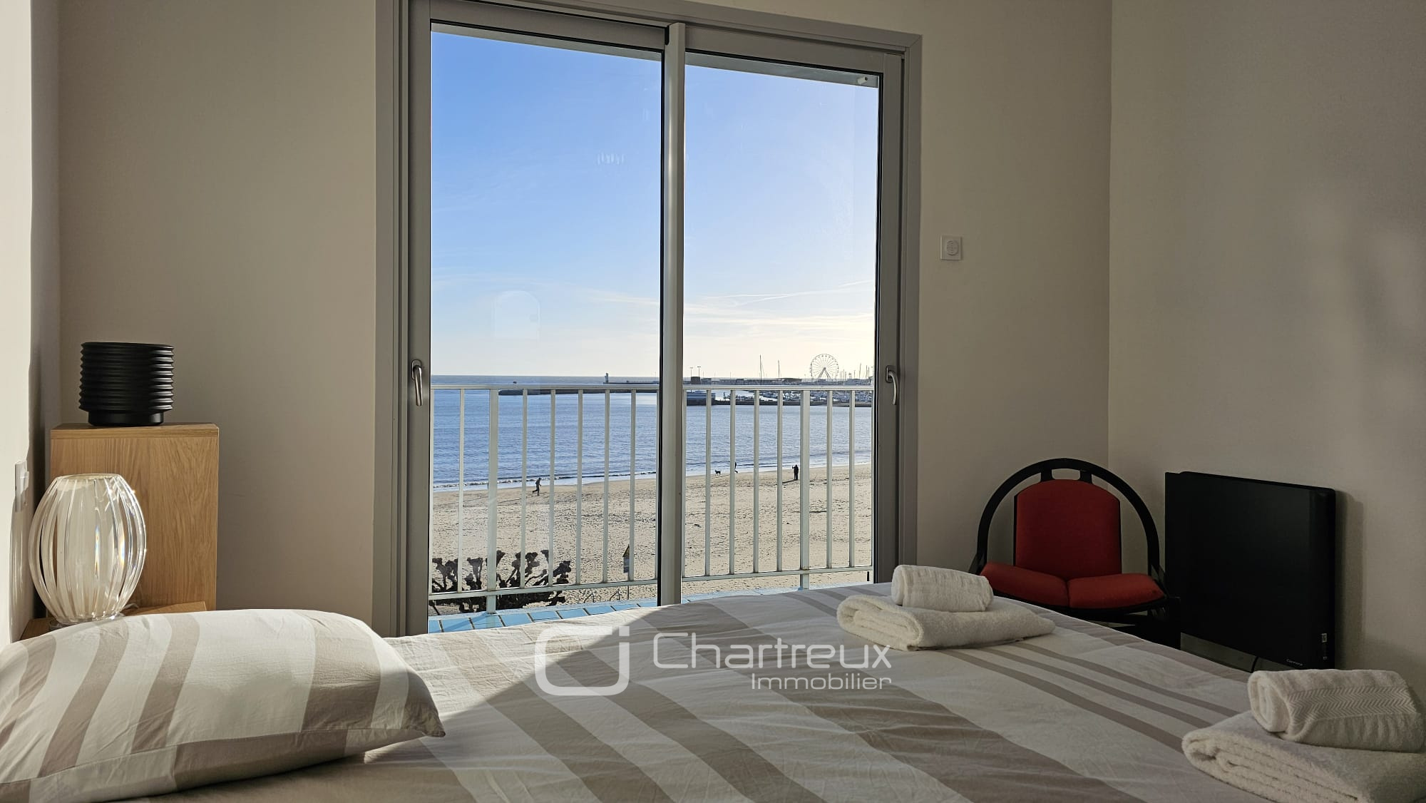 L'Agence CHARTREUX IMMOBILIER vous présente, au second étage avec ascenseur d'une résidence sécurisée, située face à la plage de la Grande Conche sur le prestigieux boulevard Frédéric Garnier, en première ligne, un APPARTEMENT avec VUE SUR MER de 3 pièces principales pour une surface habitable d'environ 50 m2 comprenant :