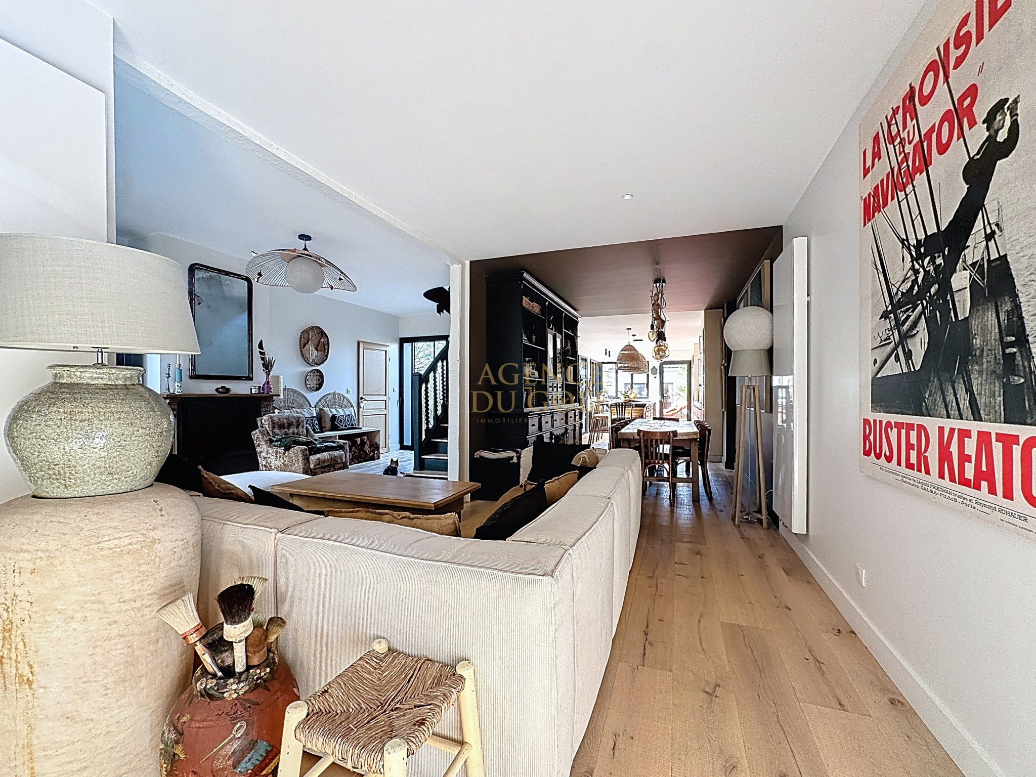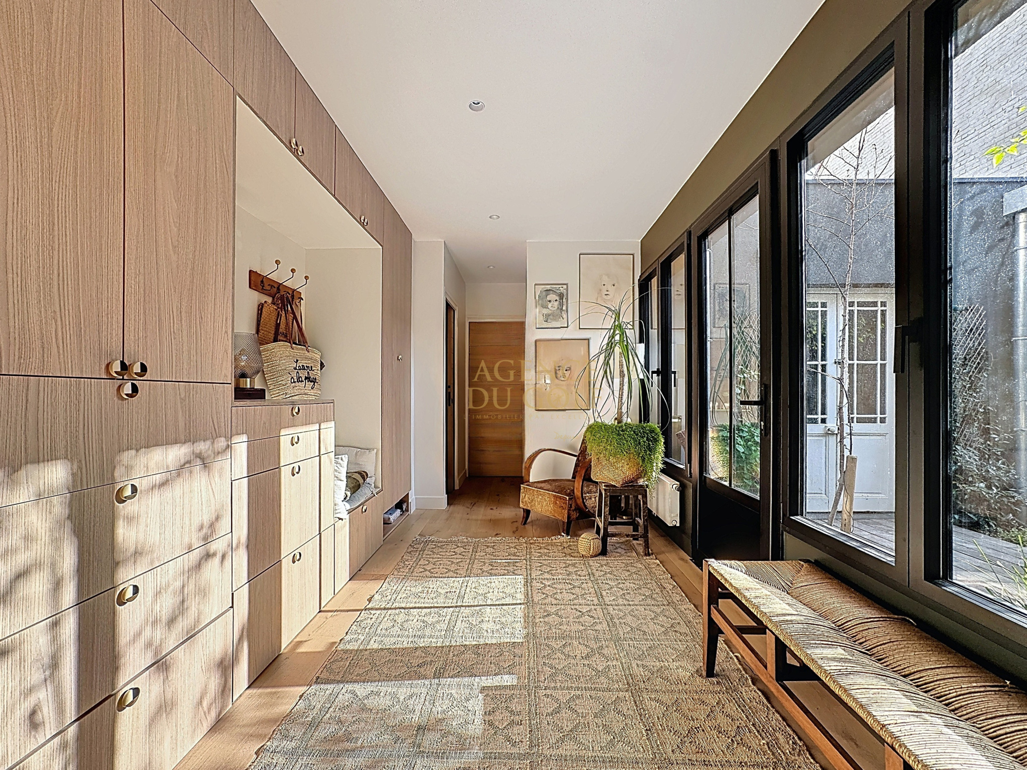 On découvre un portail qui laisse entrevoir une atmopshère particulière, une terrasse fleurie, un abri fermé aux portes d'ailleurs renferment des vélos draisiennes et autres affaires de plages... direction le hall d'entrée et déjà le ton est donné avec cette verrière style atelier, qui dévoile un intérieur de caractère. Côté droit Wc et local technique s'effacent en toute discrétion pour laisser place à la perspective salon séjour cuisine ....
