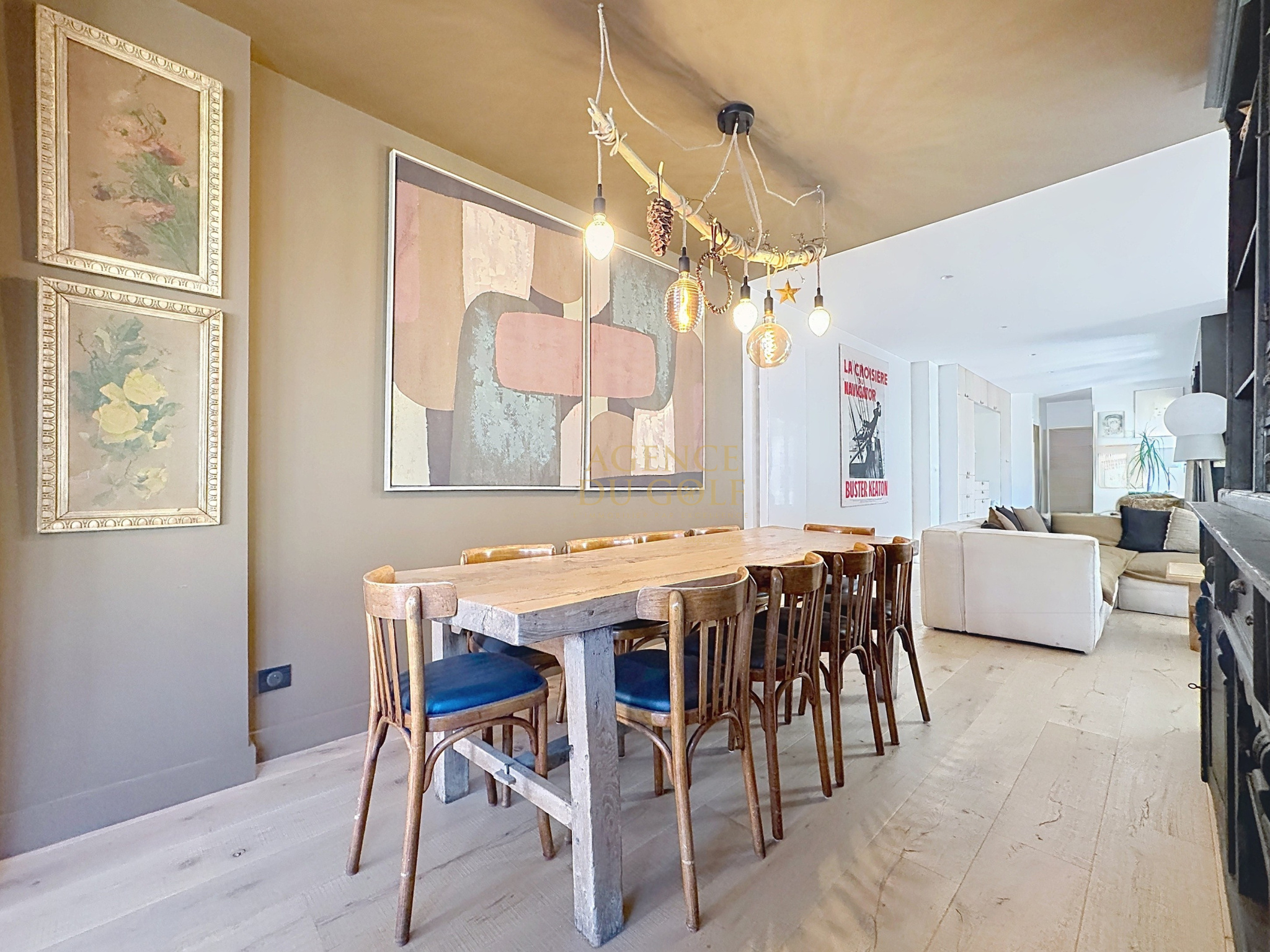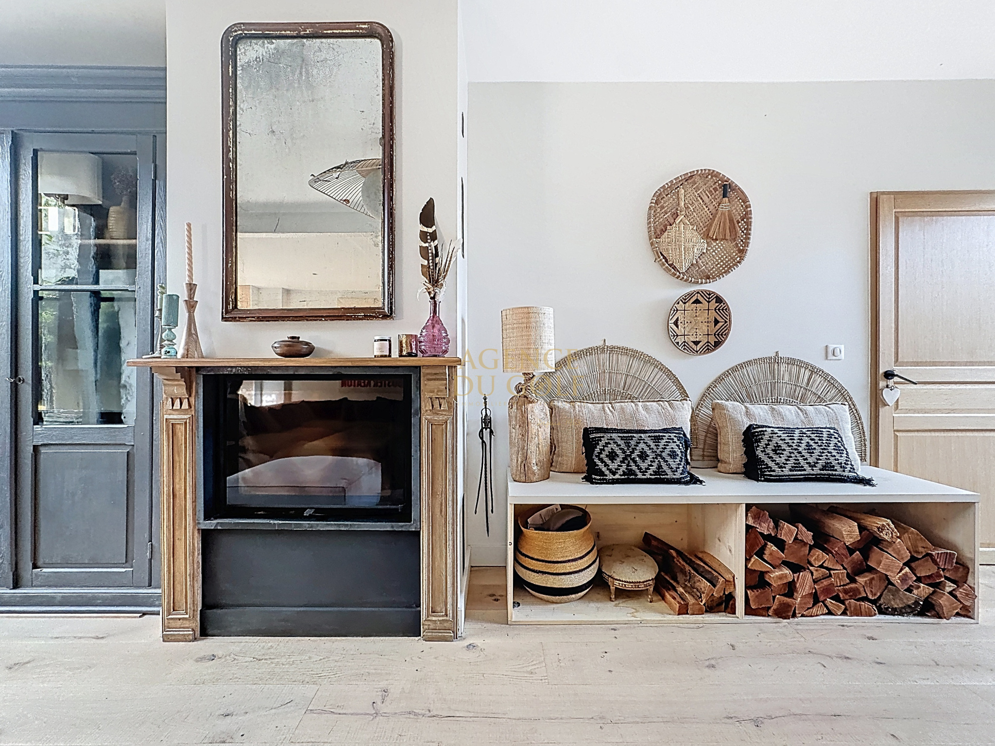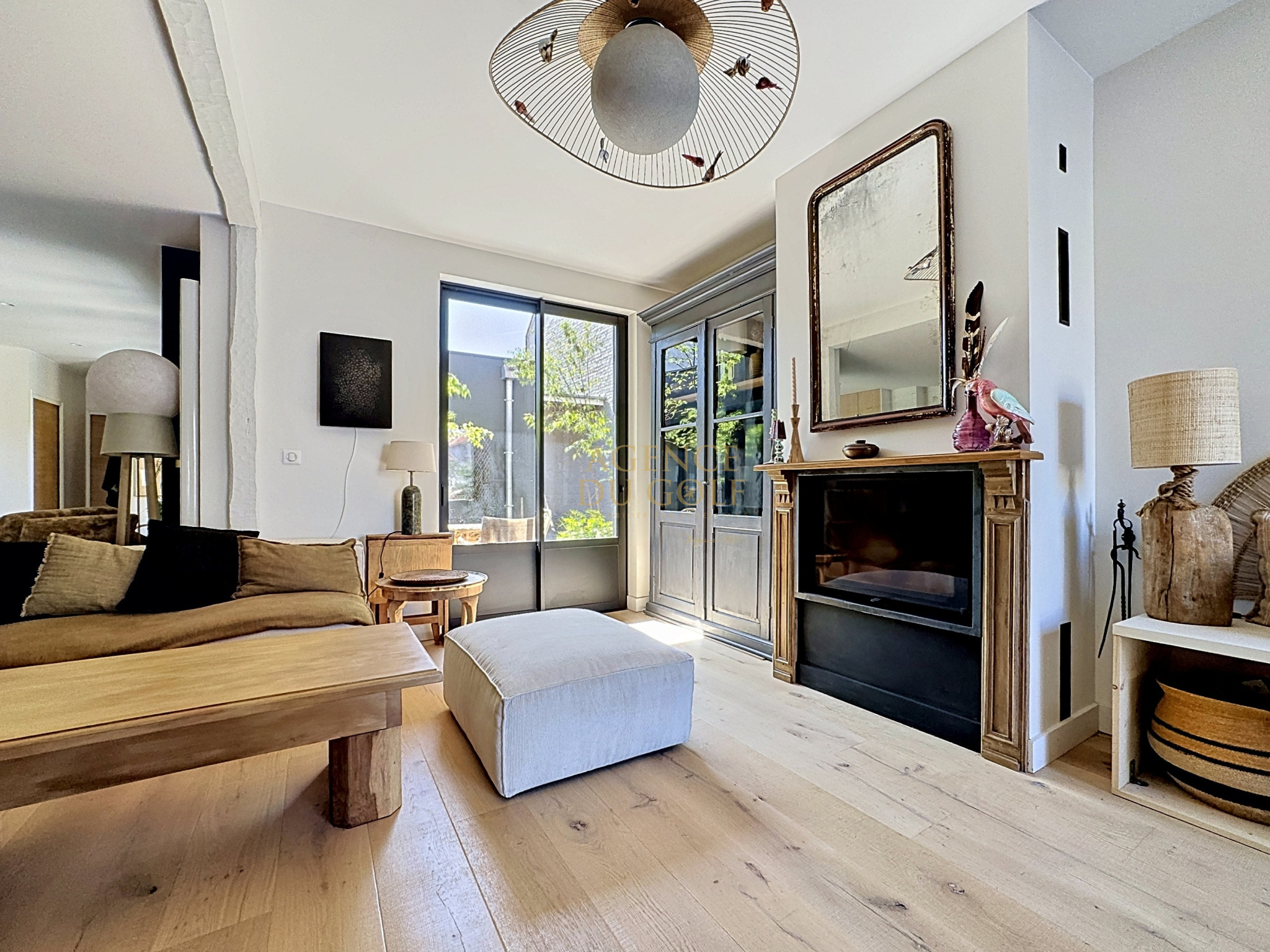 Le séjour, chaleureux et raffiné, s'articule autour d'une cheminée insert, promesse de moments partagés en toute saison.