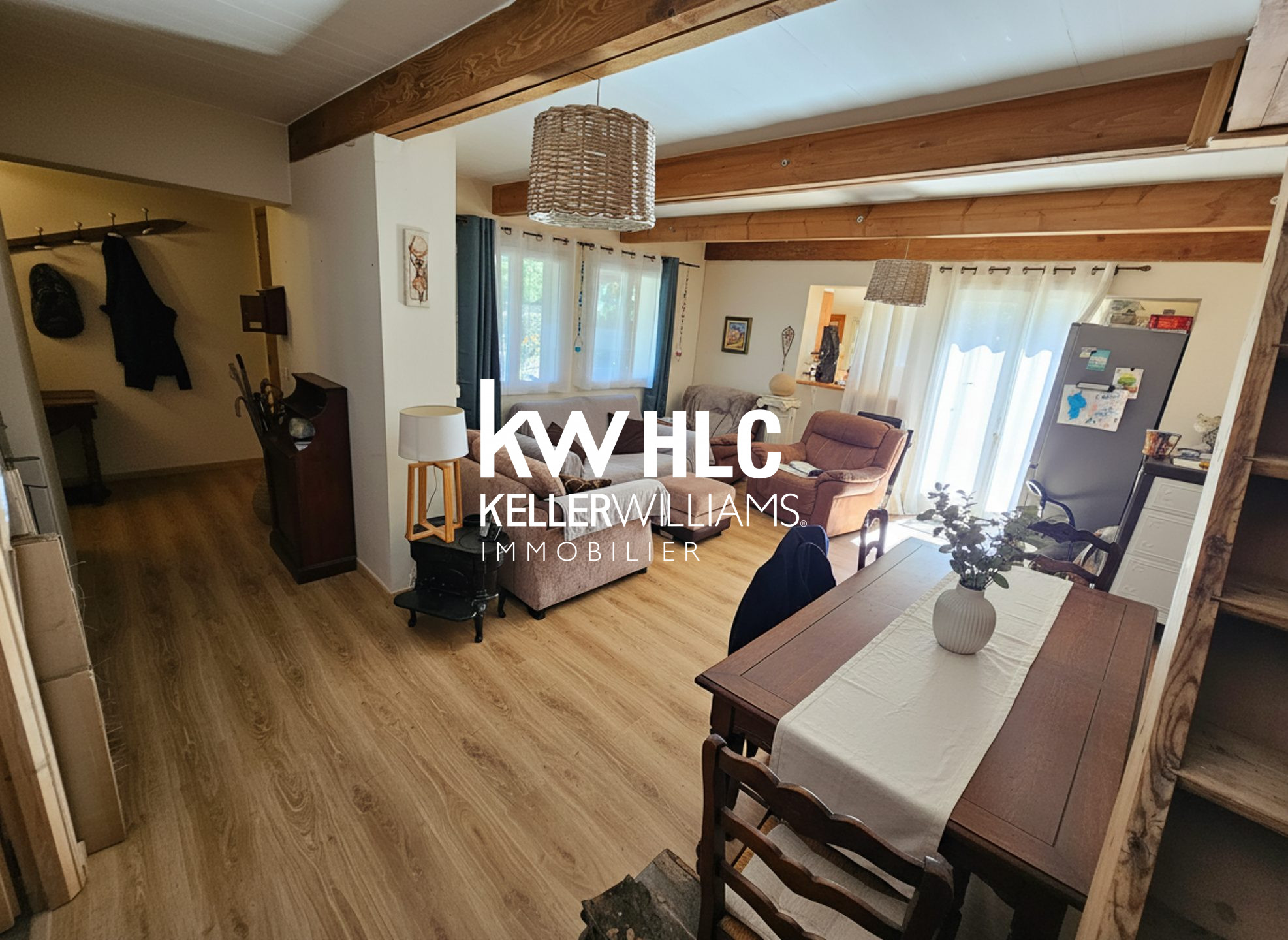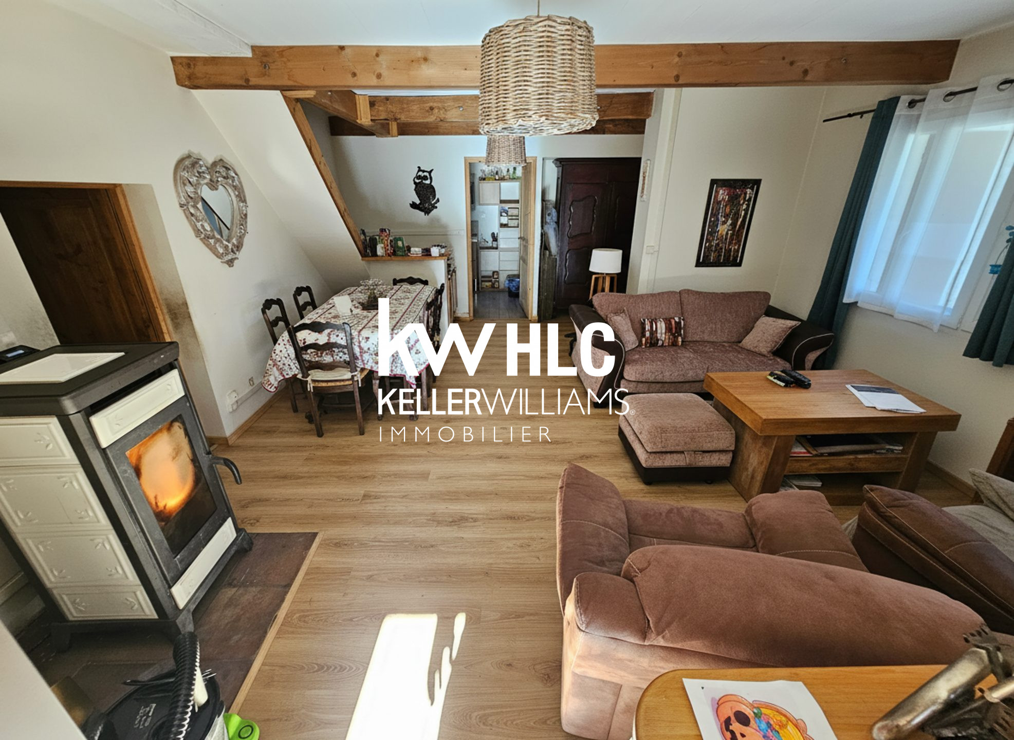 Dès l'entrée, on découvre une belle pièce de vie chaleureuse avec poutres apparentes et poêle à bois, créant une atmosphère conviviale. La cuisine ouverte sur le séjour apporte confort et fonctionnalité au quotidien.