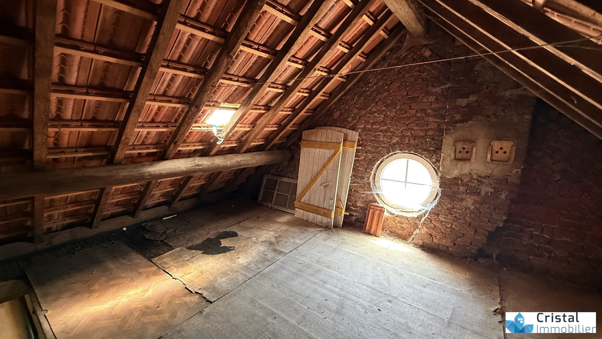 La maison se compose d'une cave, d'une entrée avec toilettes, d'une cuisine, d'un salon au rez-de-chaussée. À l'étage, vous trouverez deux chambres. Sous les combles, un joli grenier aménageable d'une surface au sol de 32 m² vous offrira un espace supplémentaire. Le tout est complété par un jardin et une petite dépendance, parfaite pour buanderie ou rangement.