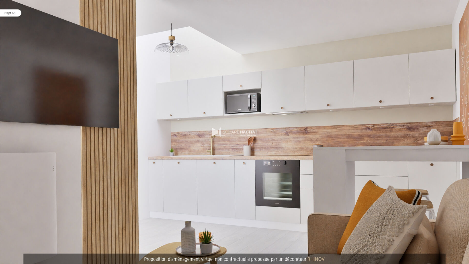 Pièce de vie / cuisine équipée ouvertes sur jardin à usage privatif.