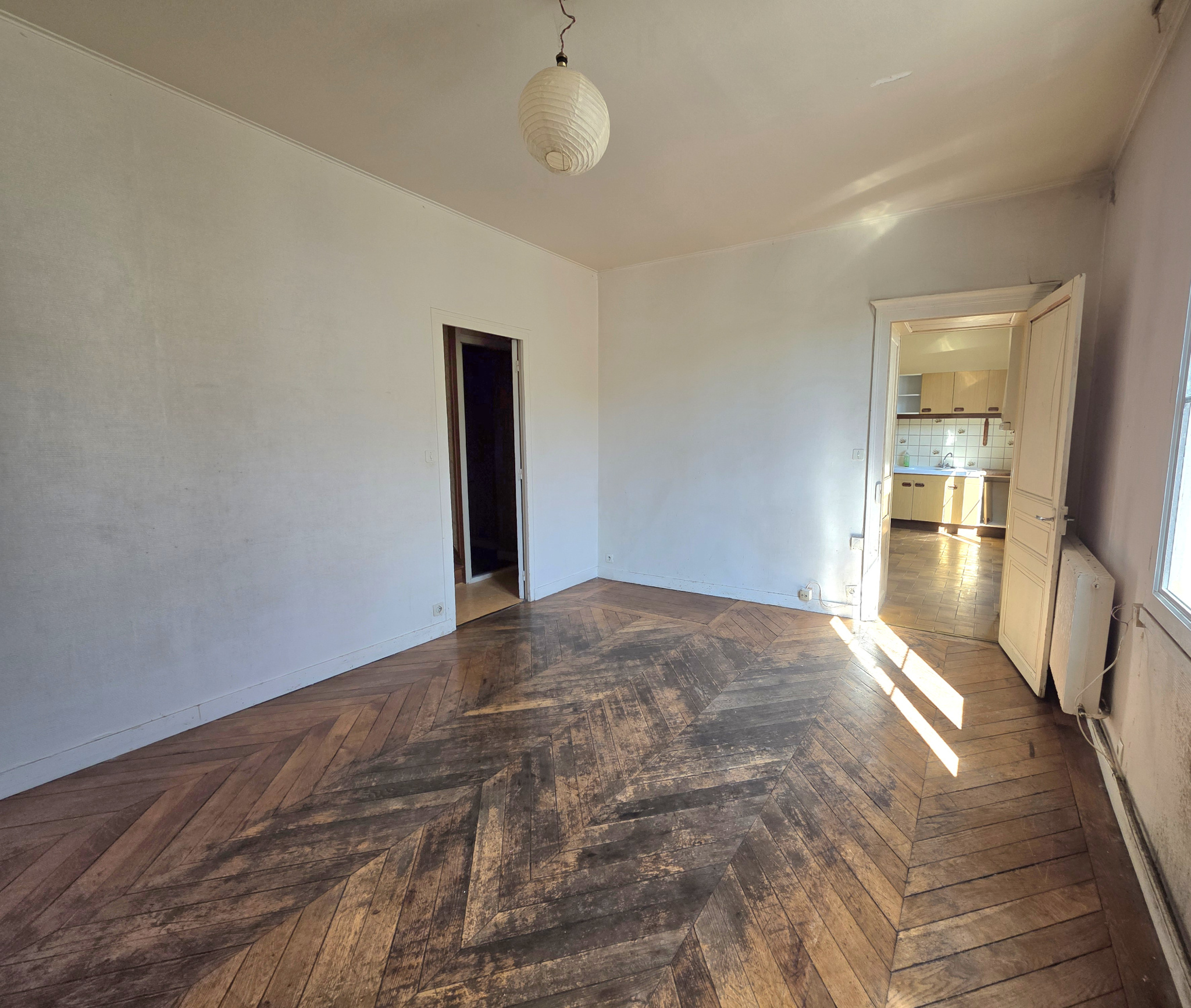 Belle pièce de vie de 31m², cuisine aménagée et équipée, deux chambres, salle d'eau et wc séparé.