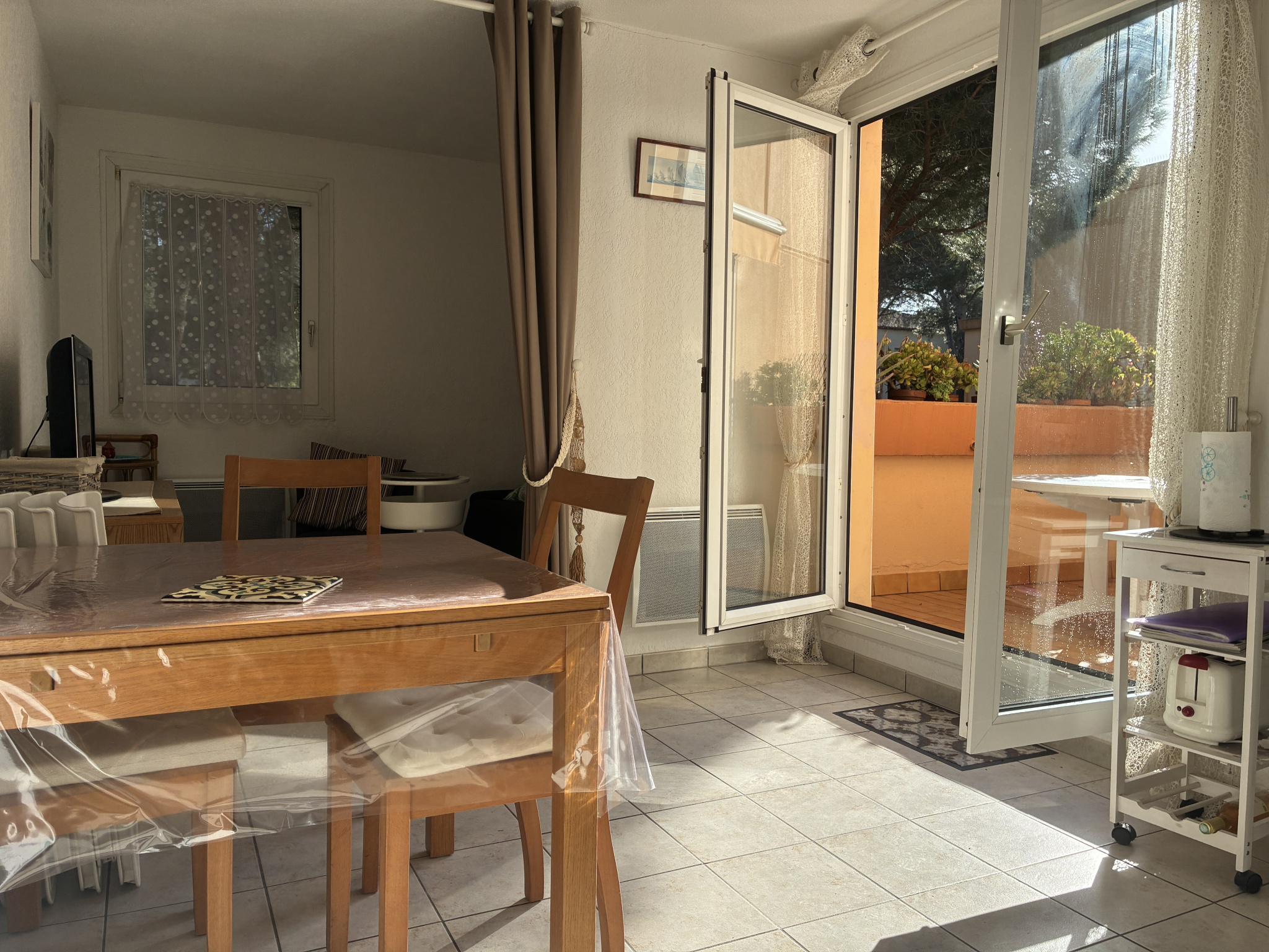 Situé à 200 mètres de la plage, au 2ème étage d'une copropriété, cet appartement vendu meublé dispose d'une pièce à vivre avec salle à manger, cuisine, coin salon.