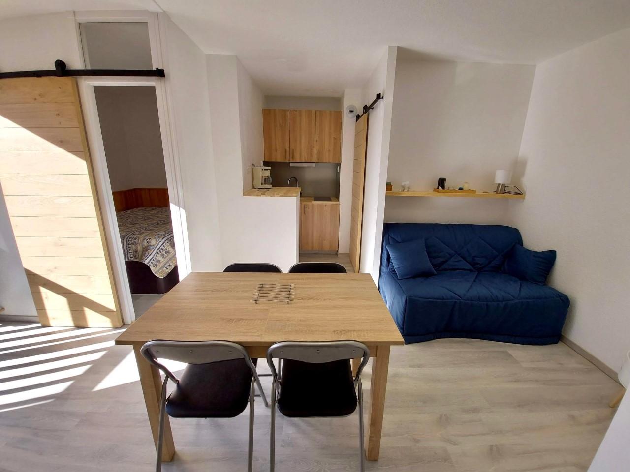 AX 3 DOMAINES, Studio + 2 cabines de 30 m² dans une copropriété de 71 lots principaux, comprenant séjour, kitchenette, coin nuit avec 2 lits superposés, placard, salle de bains-wc et cellier en pied de palier aménagé en chambre supplémentaire. Vendu meublé ave...