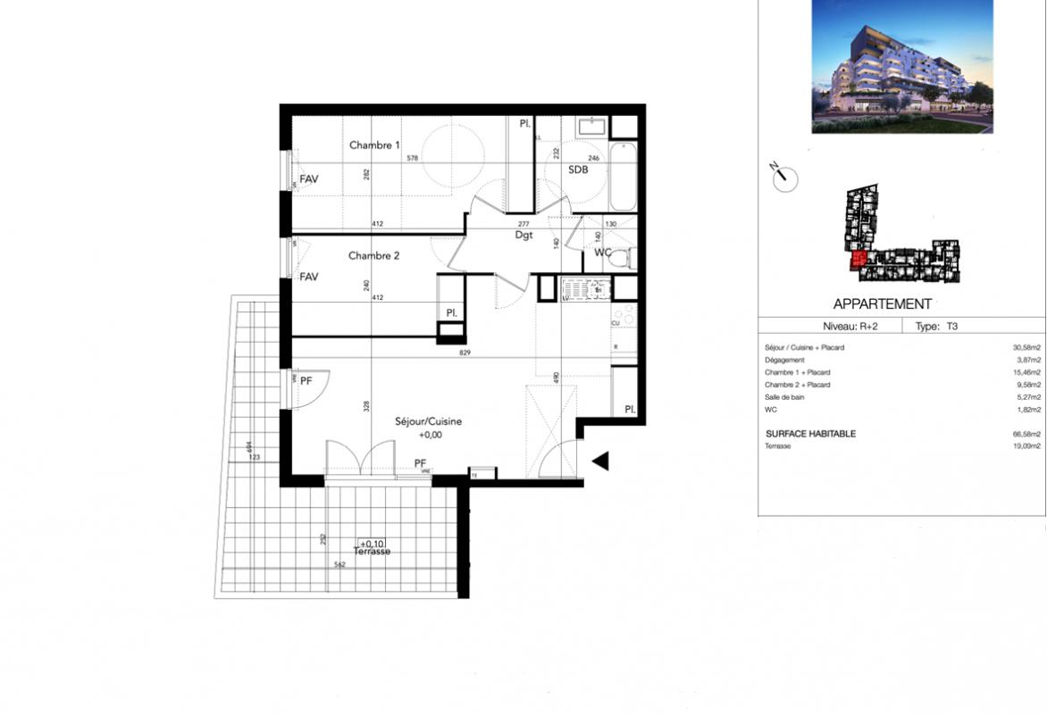 T3 67 m² troisième étage avec terrasse de 19 m² Ouest, Béziers (Avenue du Président Wilson)