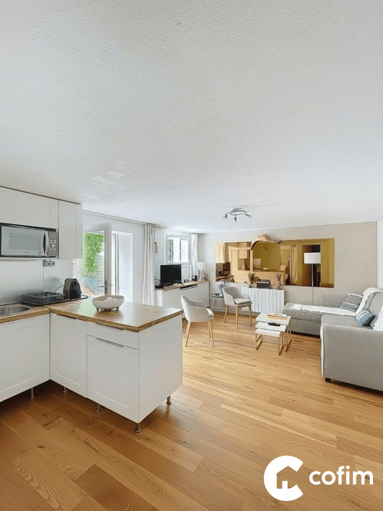 L'appartement dispose d'une kitchenette ouverte sur une pièce de vie lumineuse et équipée.
