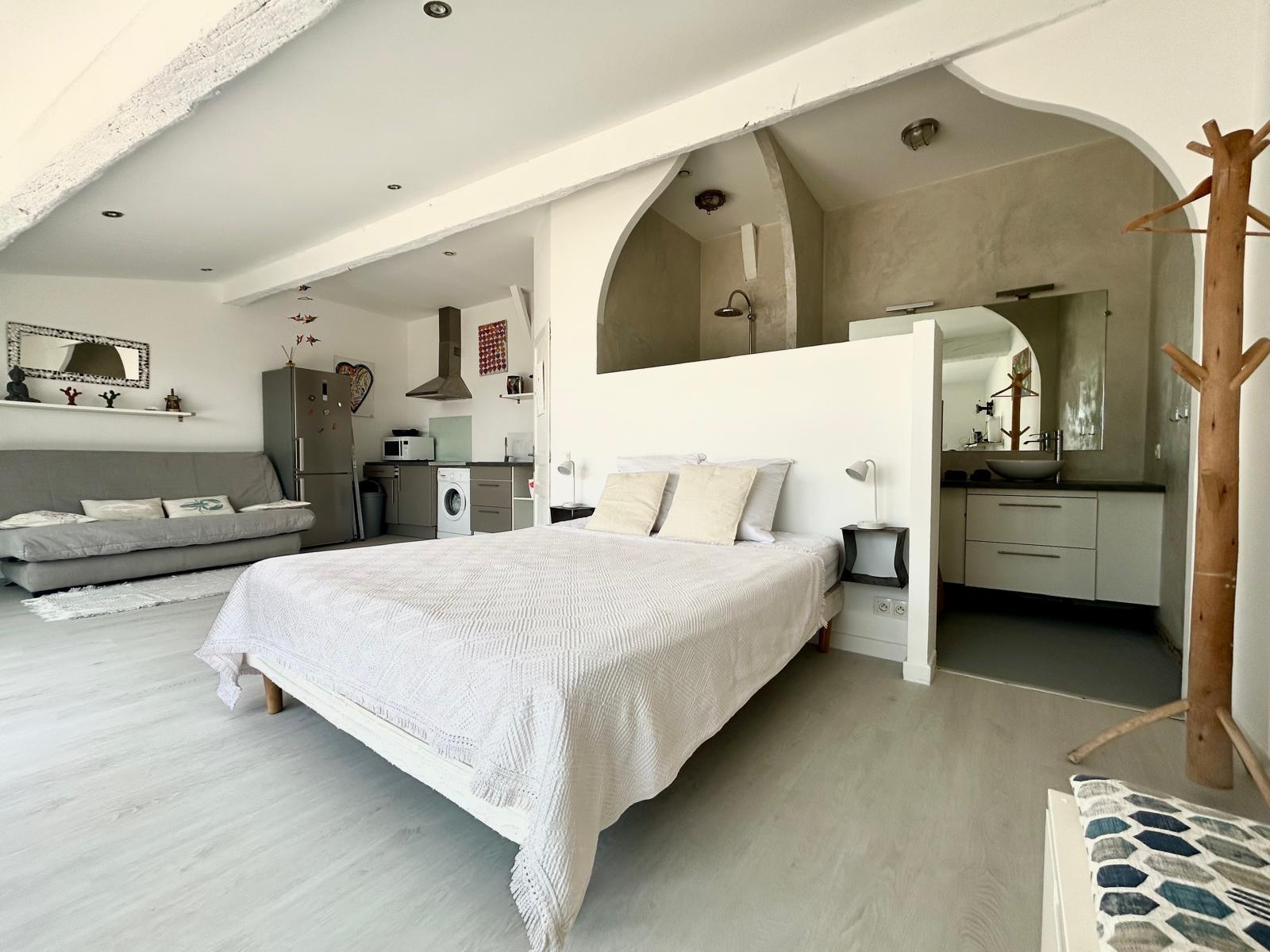 Salon séjour lumineux avec cuisine ouverte sur terrasse, chambre de 13.20m² située coté jardin, grand dégagement et salle de bain contempo...