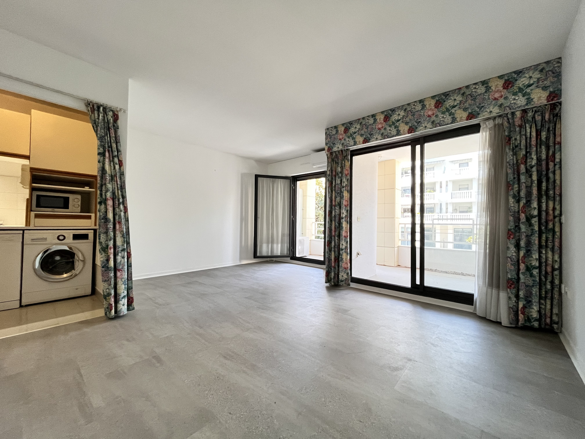 CANNES Proche banane Dans une résidence sécurisée, appartement 2 pièces en très bon état, lumineux, au calme absolu, sans vis à vis. Il se compose d'une entrée avec placard, séjour avec cuisine américaine ouvrant sur terrasse, chambre, salle d'eau av...