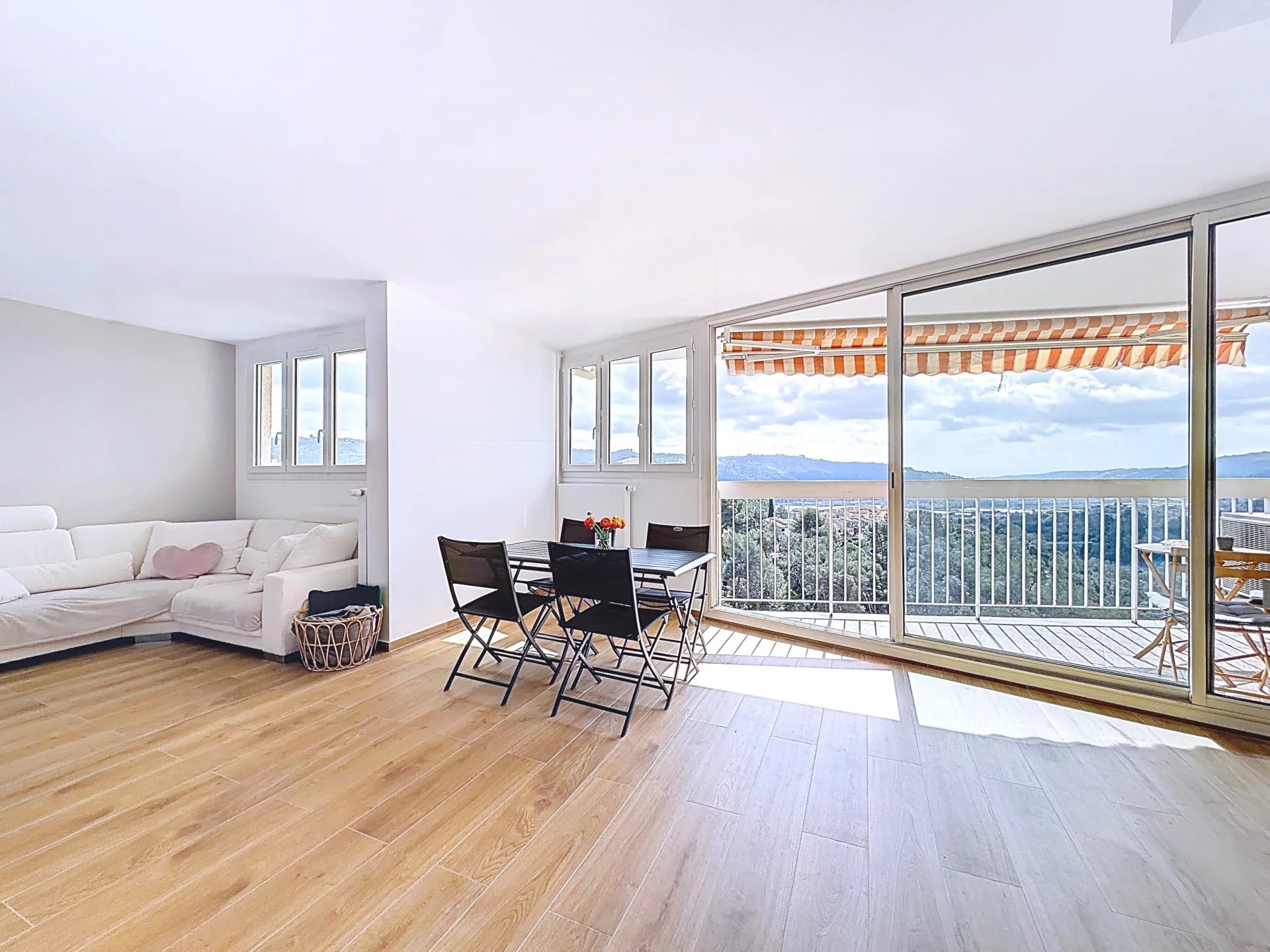 CARROS : En partie basse de la ville, dans une copropriété fraîchement ravalée, très beau 3 pièces de 77.50 m2, offrant de très beaux volumes et comprenant : Un hall d'entrée desservant un vaste double séjour climatisé et traversant d'environ 31 m2, ...