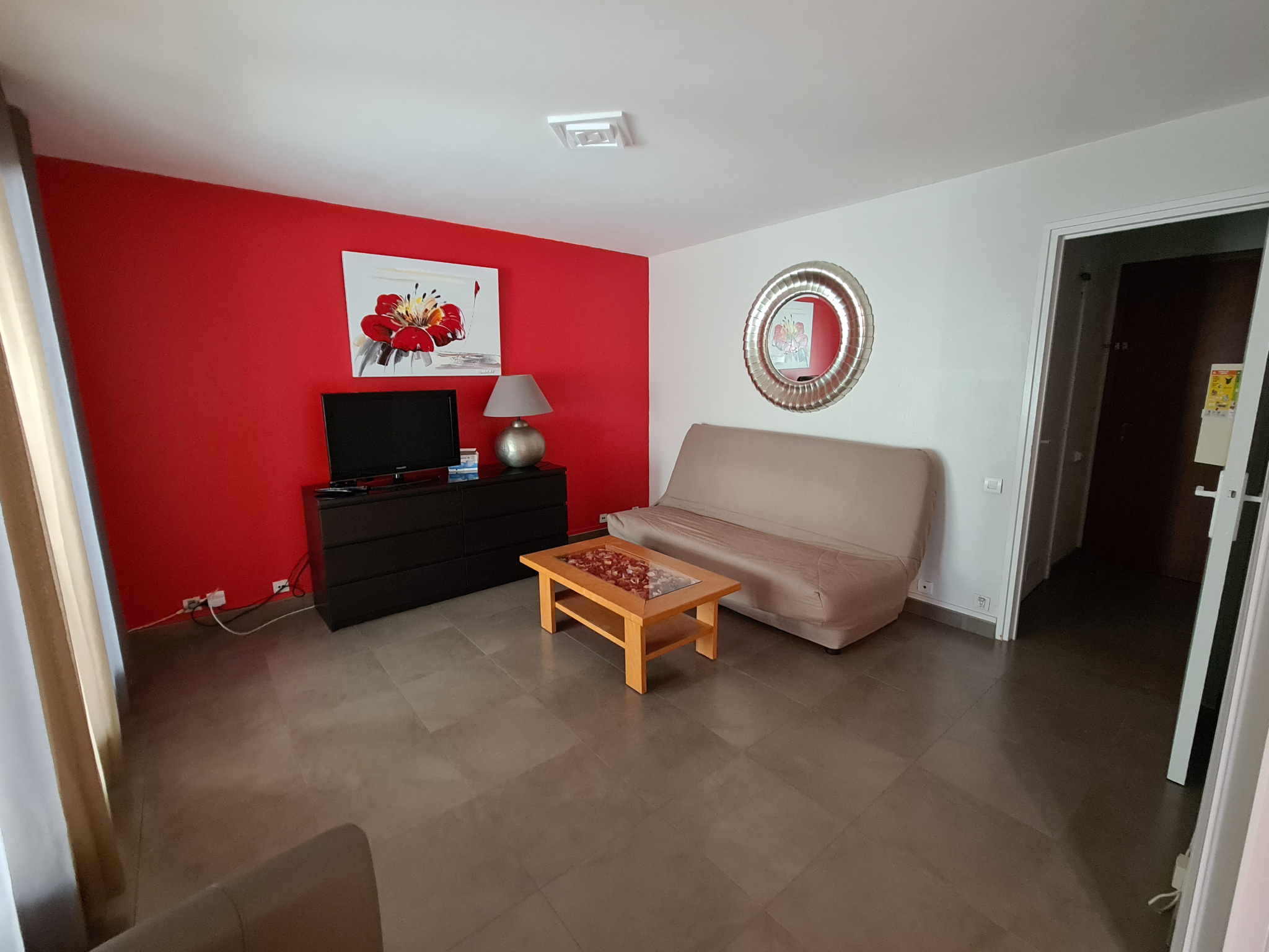 L'appartement se compose comme tel : une entrée, une salle de bain et wc indépendant, le séjour/cuisine et la chambre.