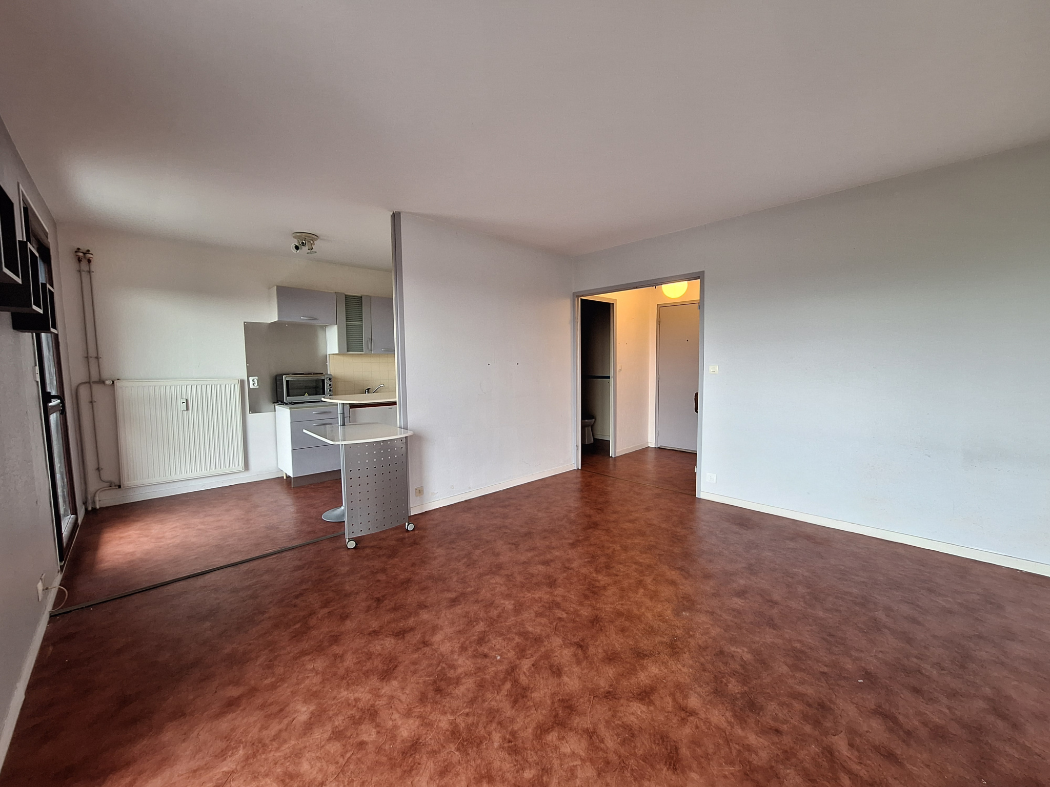 L'appartement comprend une entrée, une cuisine ouverte donnant sur le salon, une chambre, une salle d'eau et un WC.