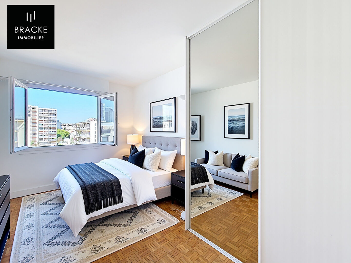 Dans un immeuble sécurisé, en centre ville , 3 pièces au 8ème étage de 69.20m² offrant une entrée, un beau séjour avec cuisine américaine aménagée et équipée, un dégagement , deux chambres, salle de bains, salle d'eau, water-closet, rangements, cellier e...