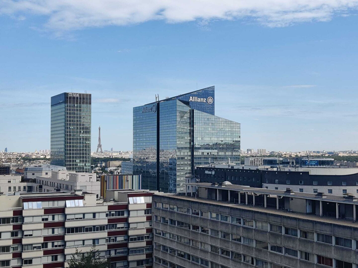 Studio, lumineux, avec vue sur Paris, comprenant entrée, séjour avec kitchenette, salle de bains avec wc.