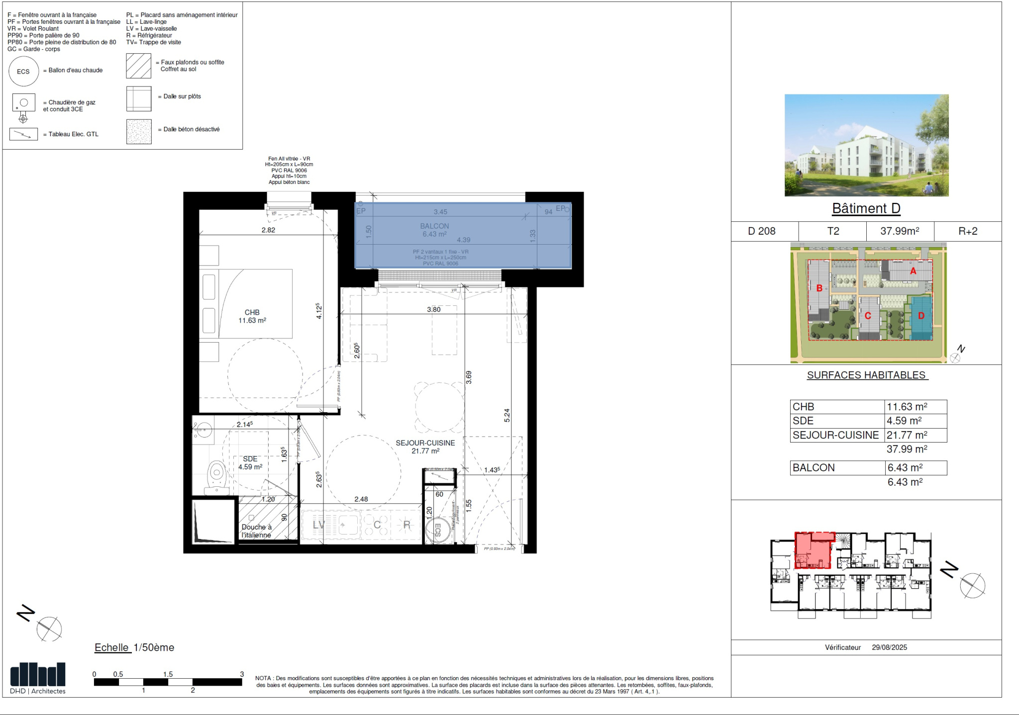 un appartement traversant de 43.79 m² (sans les loggias) offrant 2 chambres, pièce de vie avec coin cuisine,