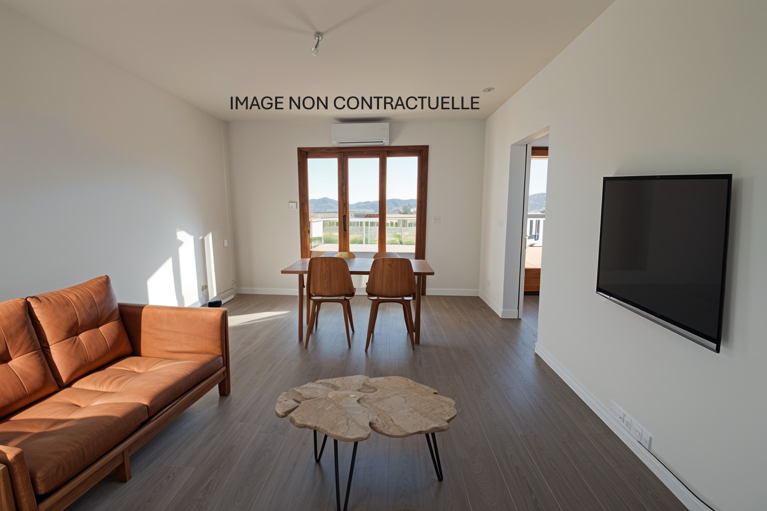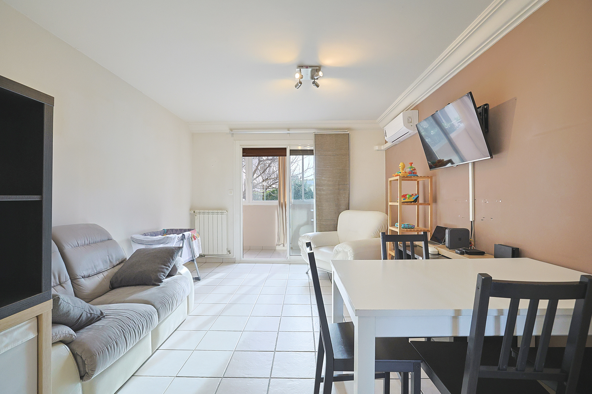 Entrée sur espace à vivre avec cuisine US aménagée et semi équipée, coin nuit, salle d'eau, WC suspendus.