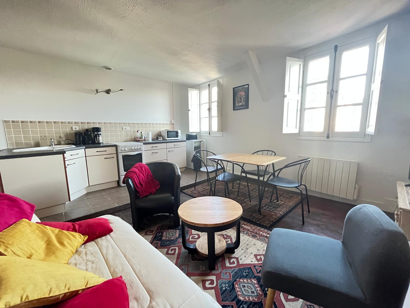Il comprend une pièce à vivre avec coin cuisine aménagée et équipée, 2 chambres, un bureau, une salle de bains et un wc.