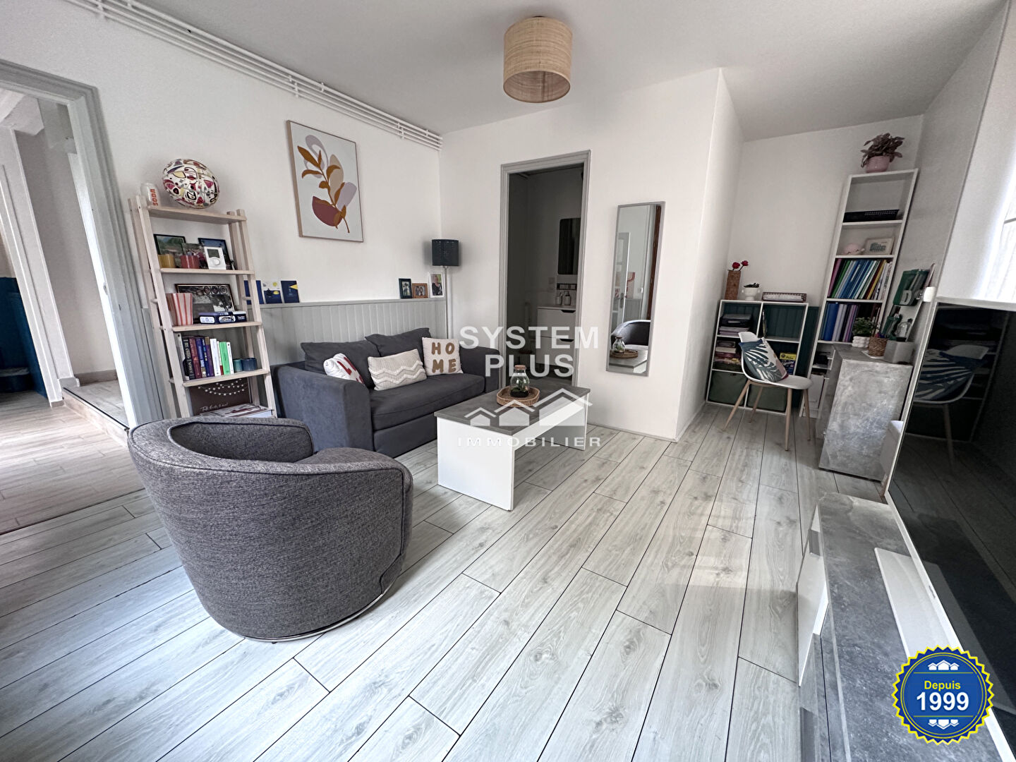 Une entrée déservant un salon/séjour avec cuisine ouverte, deux chambres, une salle d...