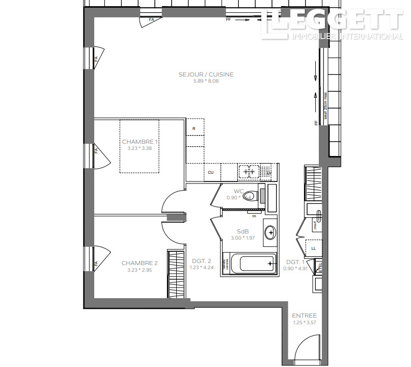 Il offre un espace de vie de 61.14 m², avec deux chambres et un séjour avec coin cuisine, ouvert sur le balcon et sa vue lac.