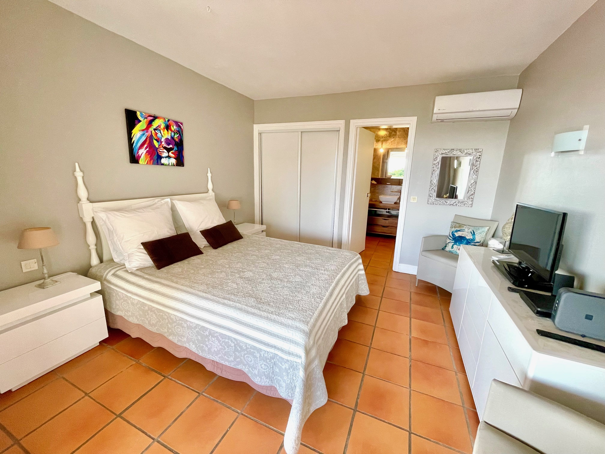 ANSE DES ROCHERS VUE MER : 1/4 de villa étage de 34 m2 (terrasse comprise) meublé, avec accès plage, piscine et tennis. Résidence sécurisée avec parking, gardien et restaurant. Emplacement proche plage et à l'abri des regards. Vue MER ET JARDIN. Composé d...