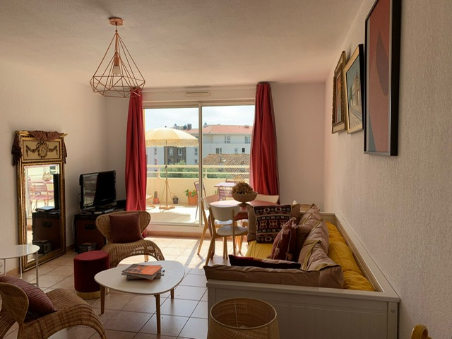 Appartement de type 3 Saint JEAN , entrée, séjour baie vitrée sur terrasse filante, une cuisine ouverte aménagée et équipée, deux chambres, placard, une salle d'eau, wc, garage en sous sol et place de parking, proche de tous commerces et plages.