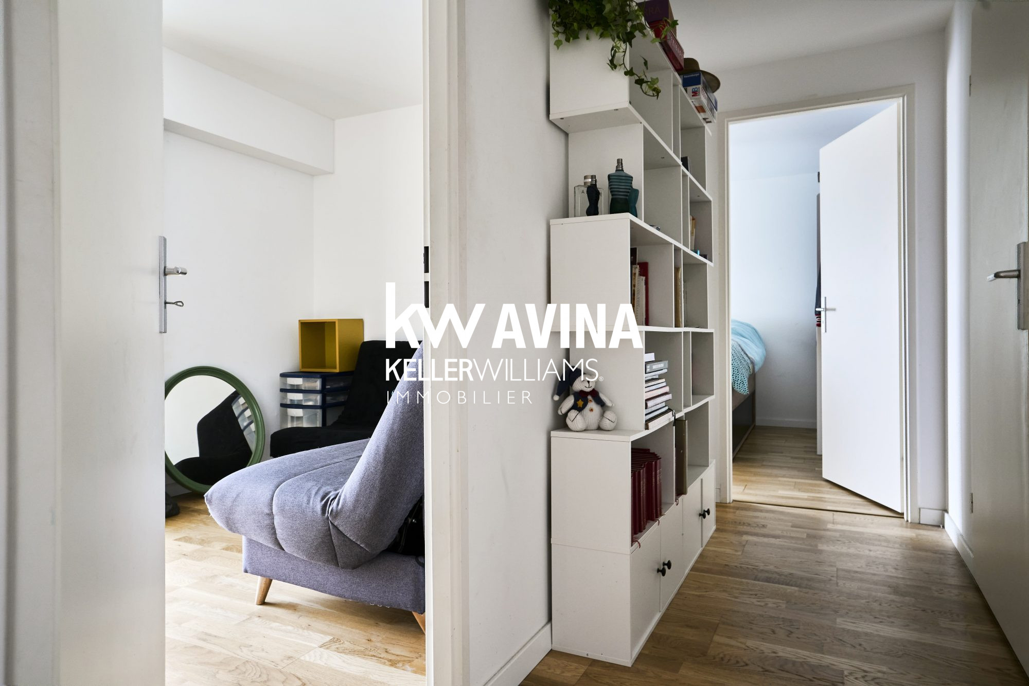 Dès l’entrée, les rangements intégrés offrent un espace vestiaire fonctionnel et s’ouvrent sur un agréable espace de réception d’envi...