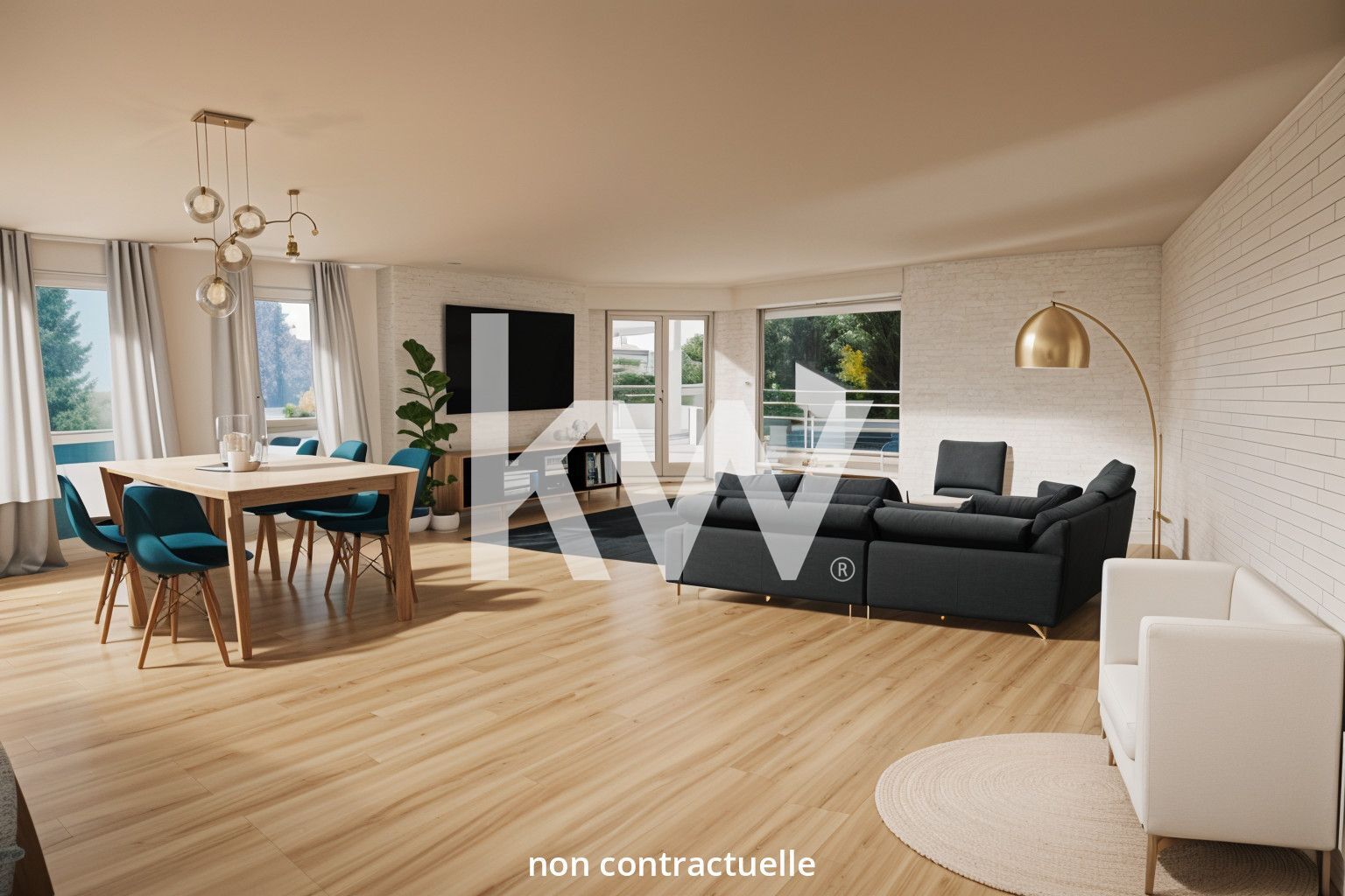 Une belle entrée dessert la pièce de vie lumineuse, prolongée par une cuisine sem...