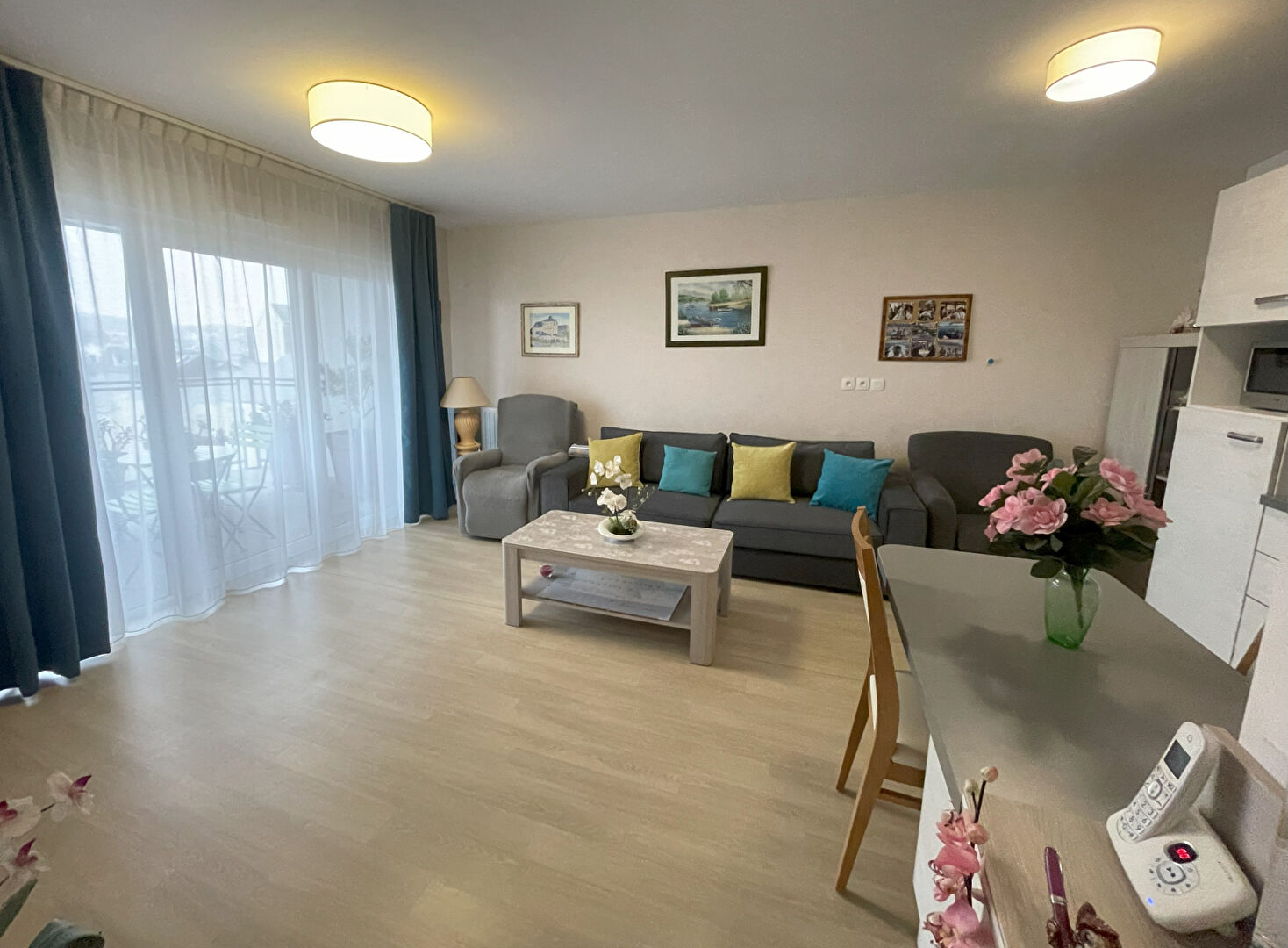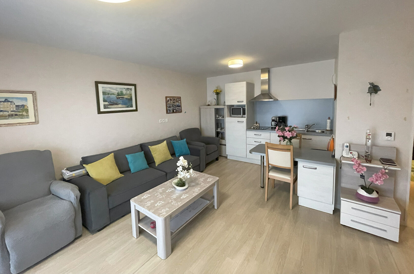 A VENDRE-LANDERNEAU- Le centre ville, le pont habité ainsi que son marché à pied de cet appartement de deux pièces principales situé au deuxième étage de la résidence DOMITYS La Fleur de Lin, comprenant: hall d'entrée avec penderie, une cuisine aménagée ...
