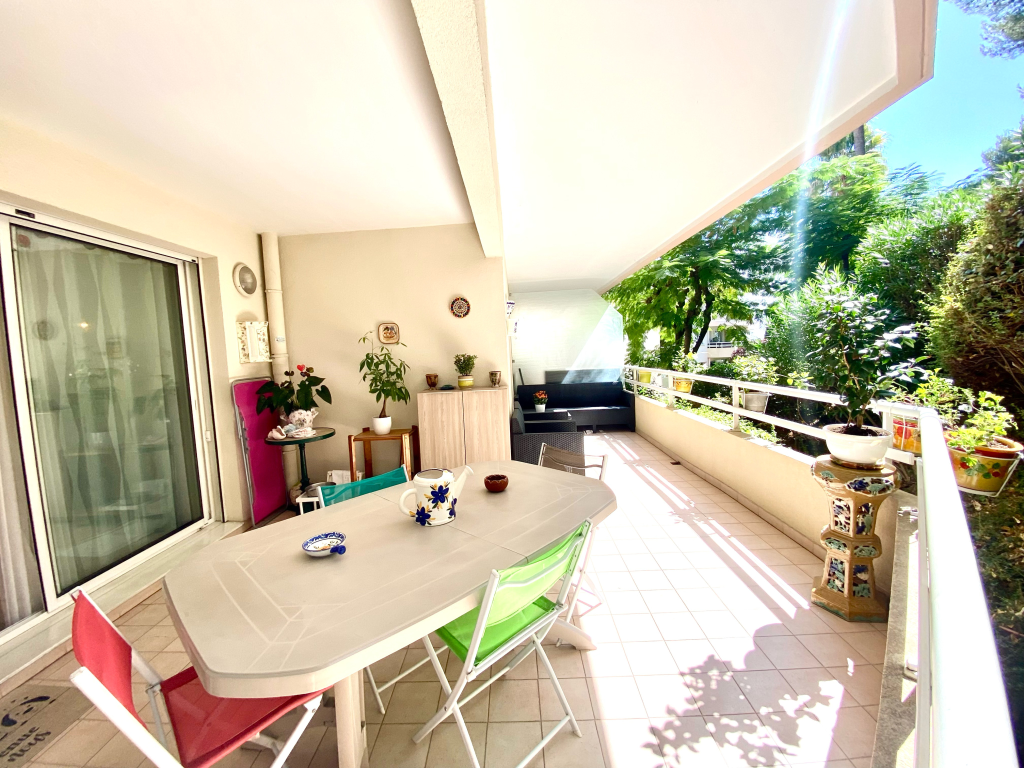 Situé au calme et proche commodités, dans résidence gardiennée avec parc arboré et piscine, spacieux et lumineux F2 climatisé de 64.55 m² avec terrasse de 20 m² et rez-de-jardin de 24 m².