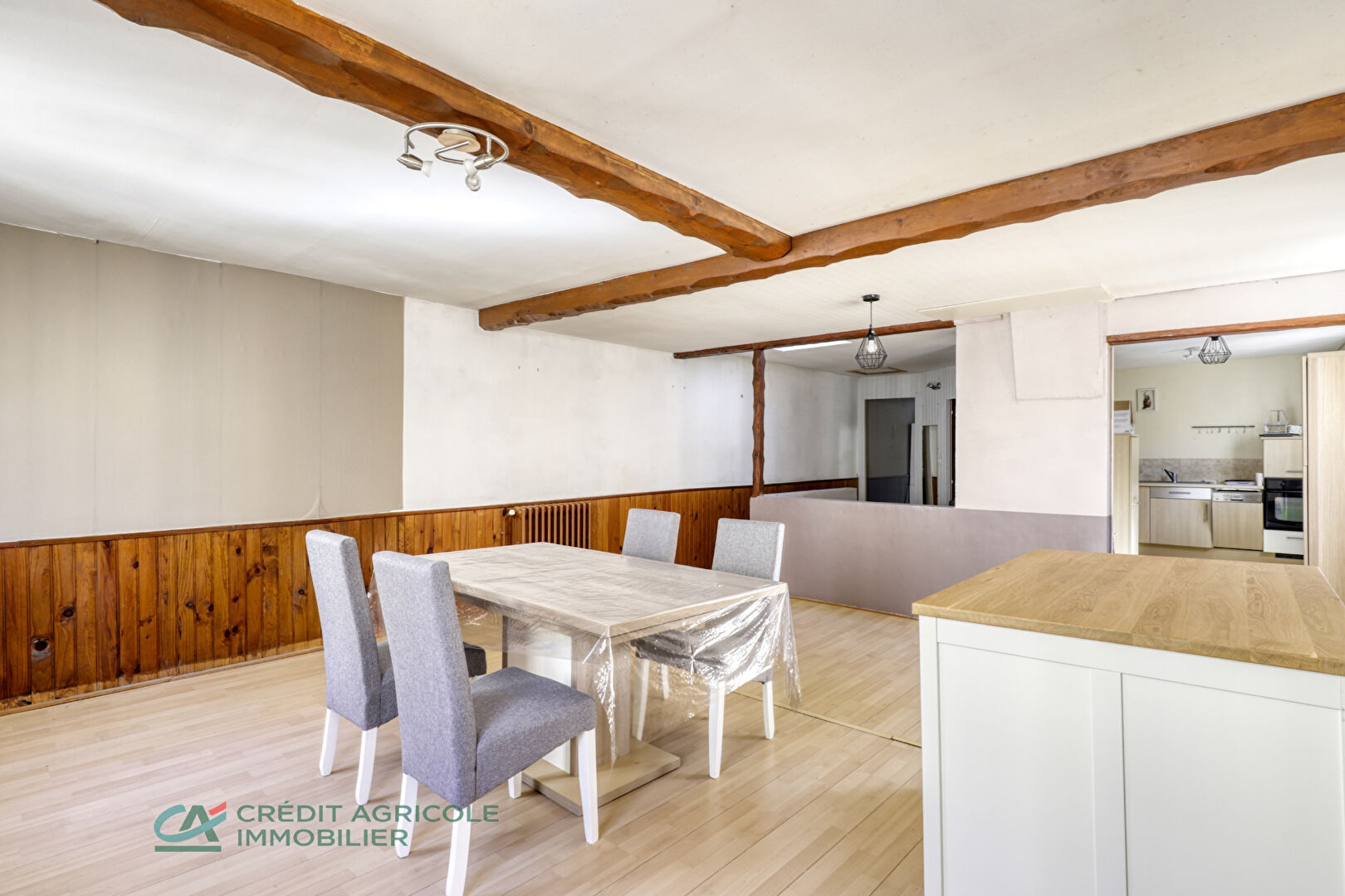 Cuisine aménagée américaine ouverte sur une pièce de vie entièrement rénovée.