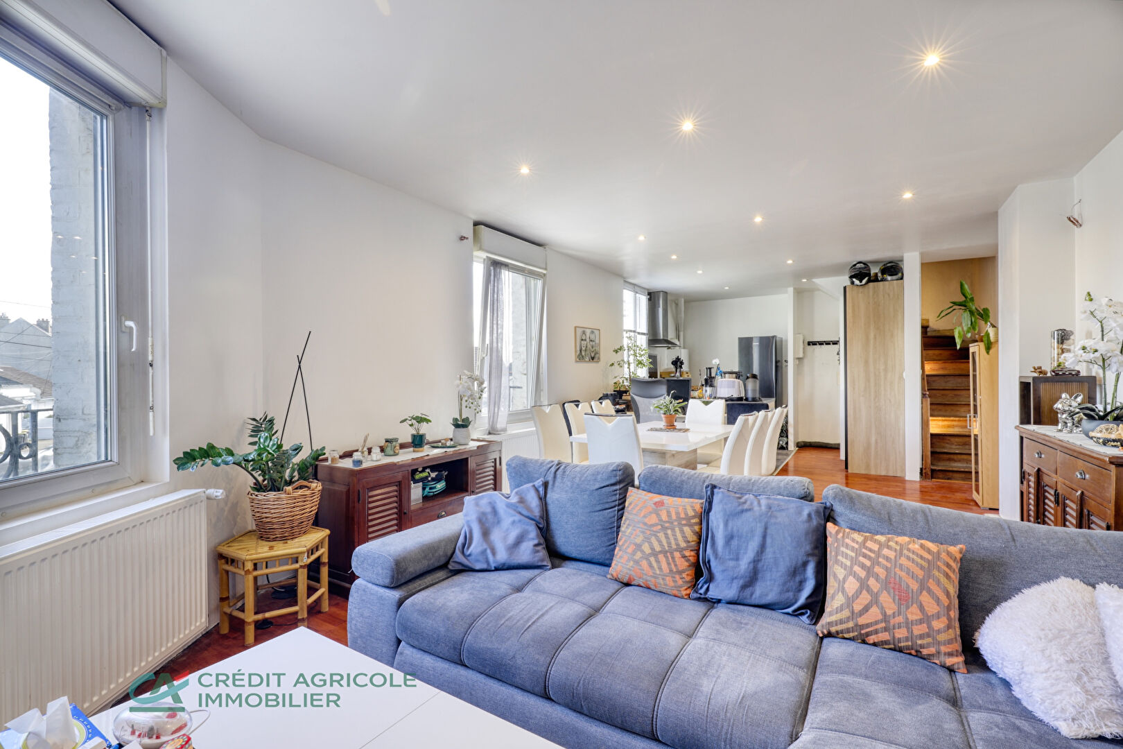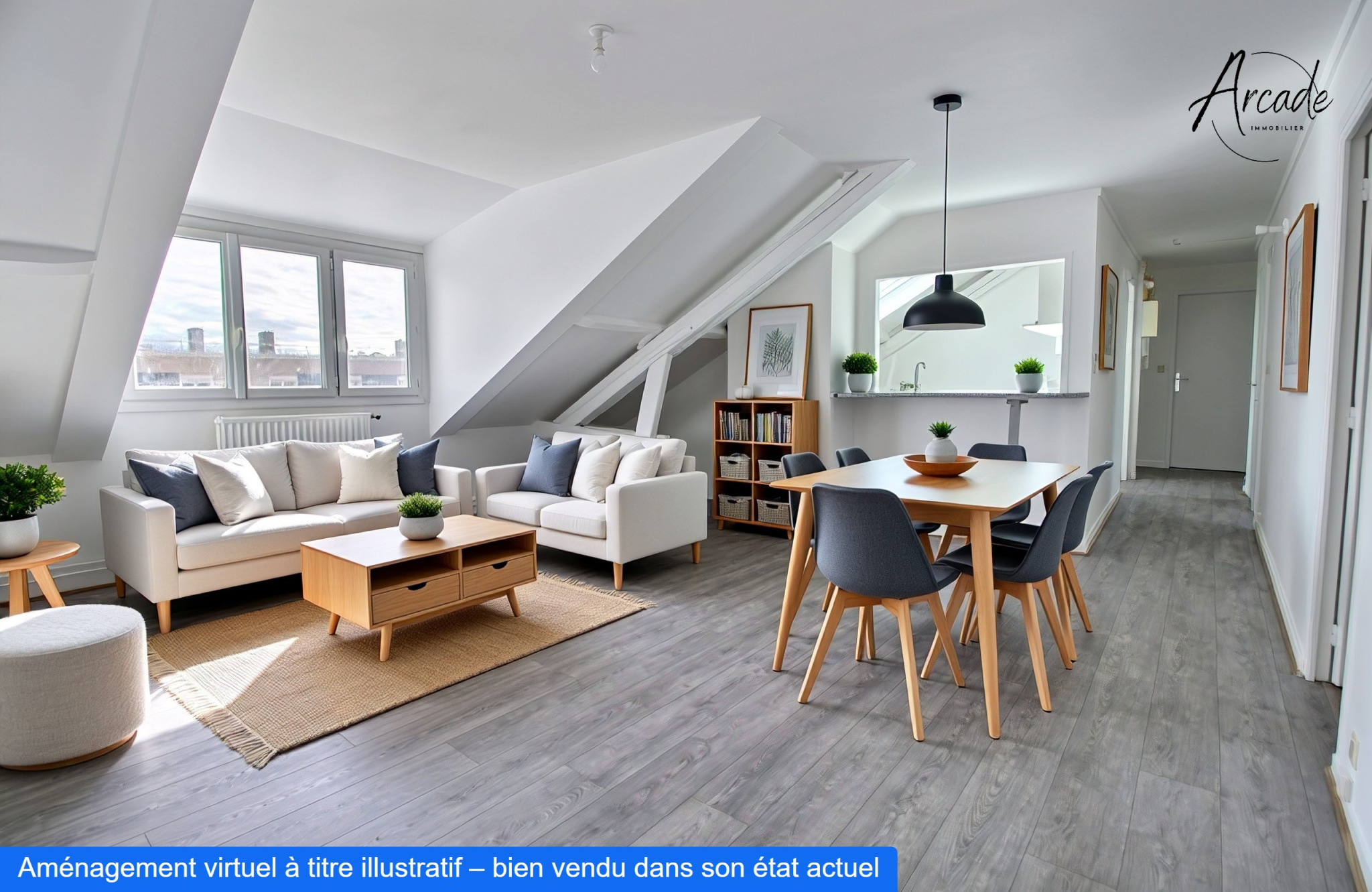 Beaux volumes pour cet appartement F4 mansardé de 66.20 m2 Carrez et 93.63 m2 au sol.et comprenant : entrée, dégagement, séjour-salon + cuisine USA 34 m2 Sud, 3 chambres, sa...