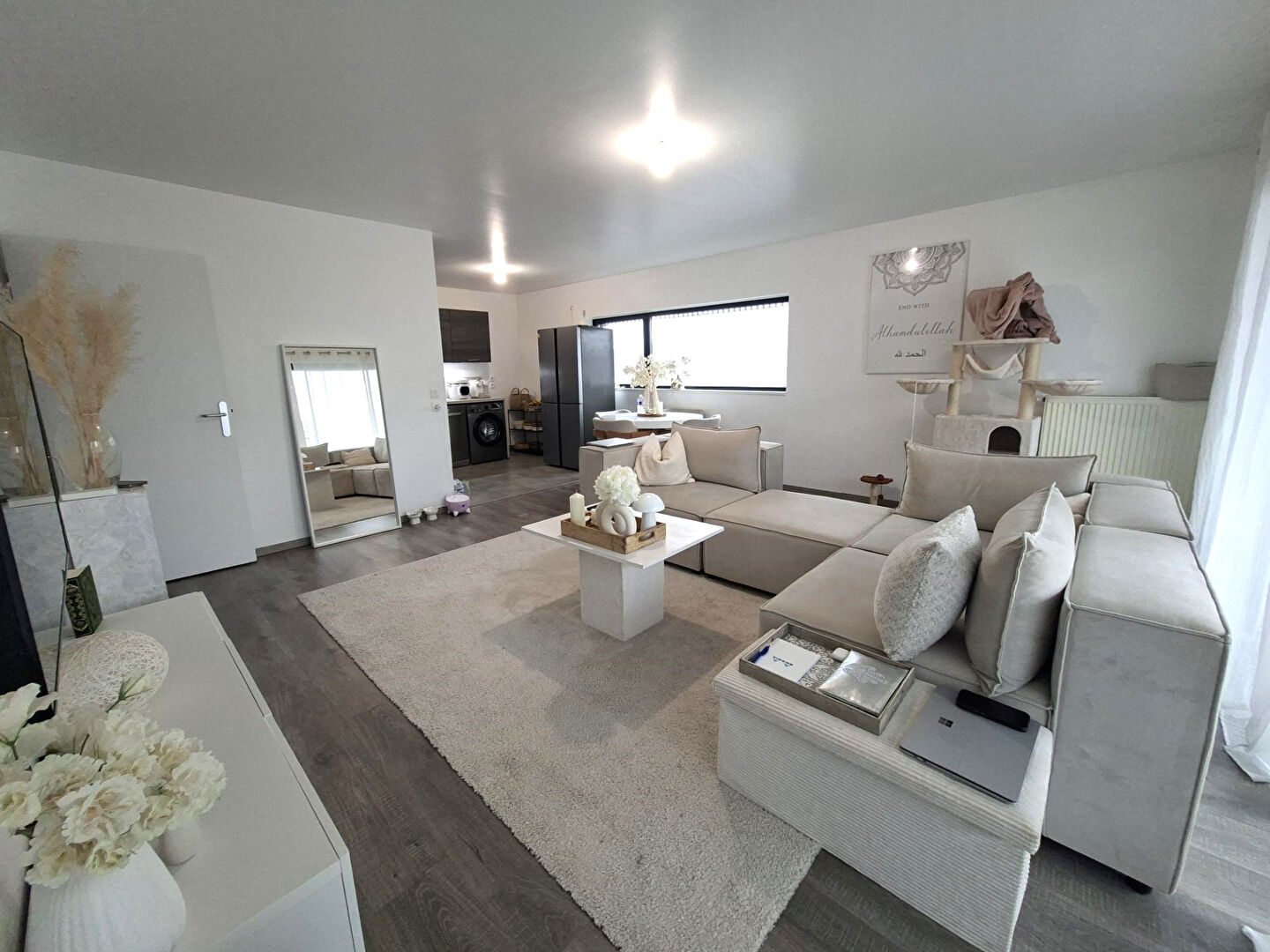 Séjour-salon avec cuisine ouverte aménagée 38 m2, 2 grandes chambres avec placards, une salle de douches ...