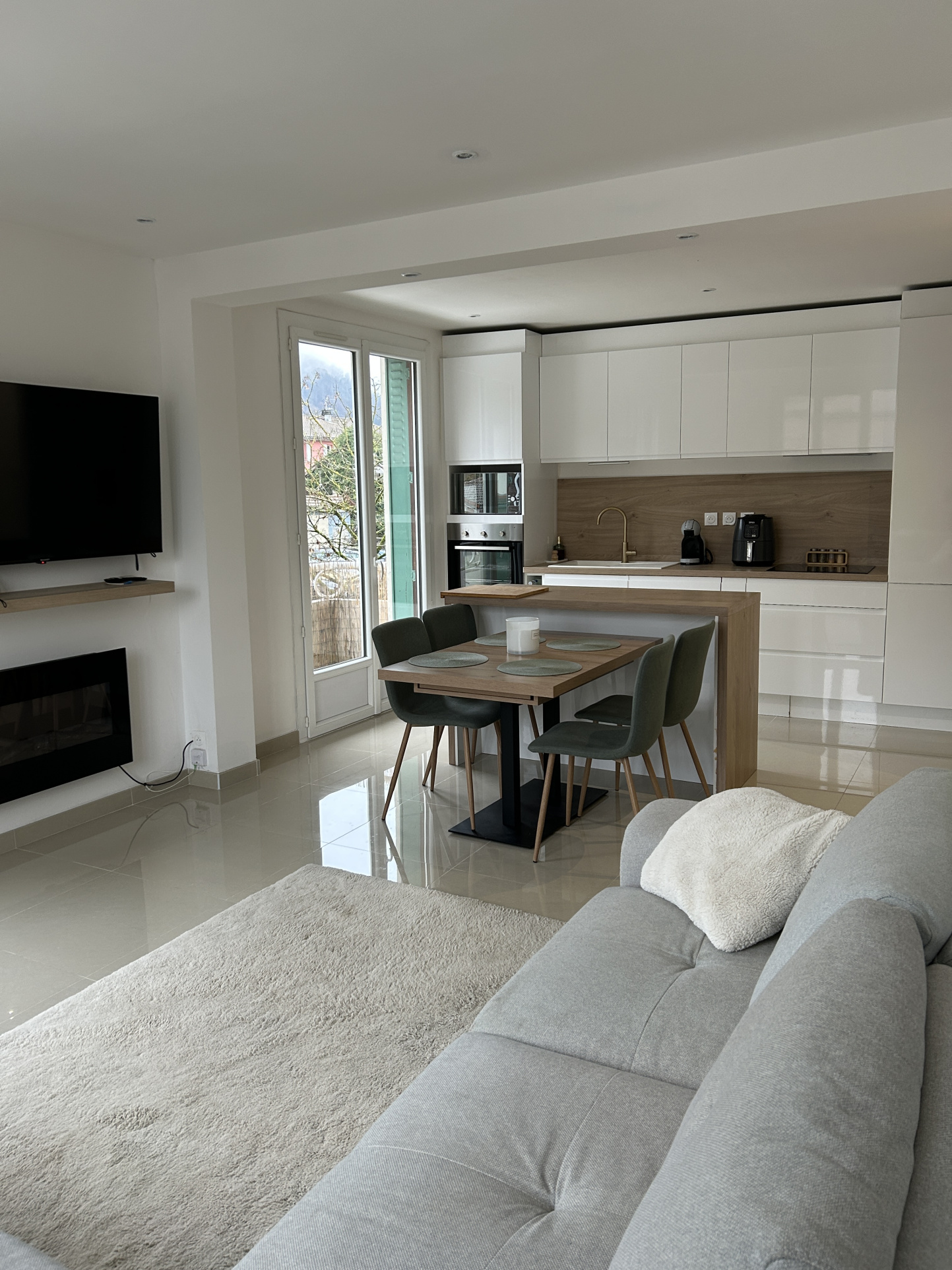 Dans une petite copropriété au premier étage sur deux, appartement type 3 entièrement refait à neuf en 2022 comprenant hall, cuisine équipée ouverte sur séjour, 2 chambres avec placards, douche à l'italienne, buandrie, fenêtre PVC double vitrage, blacon e...