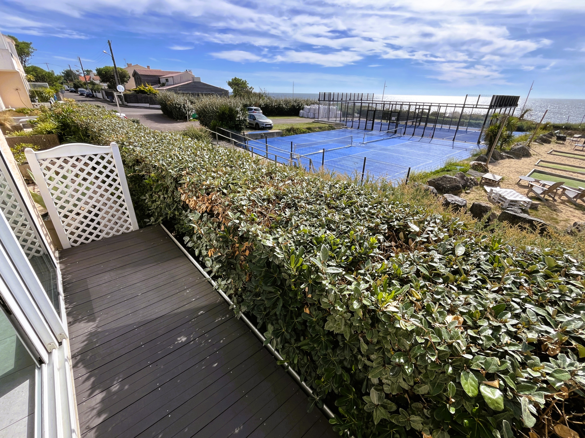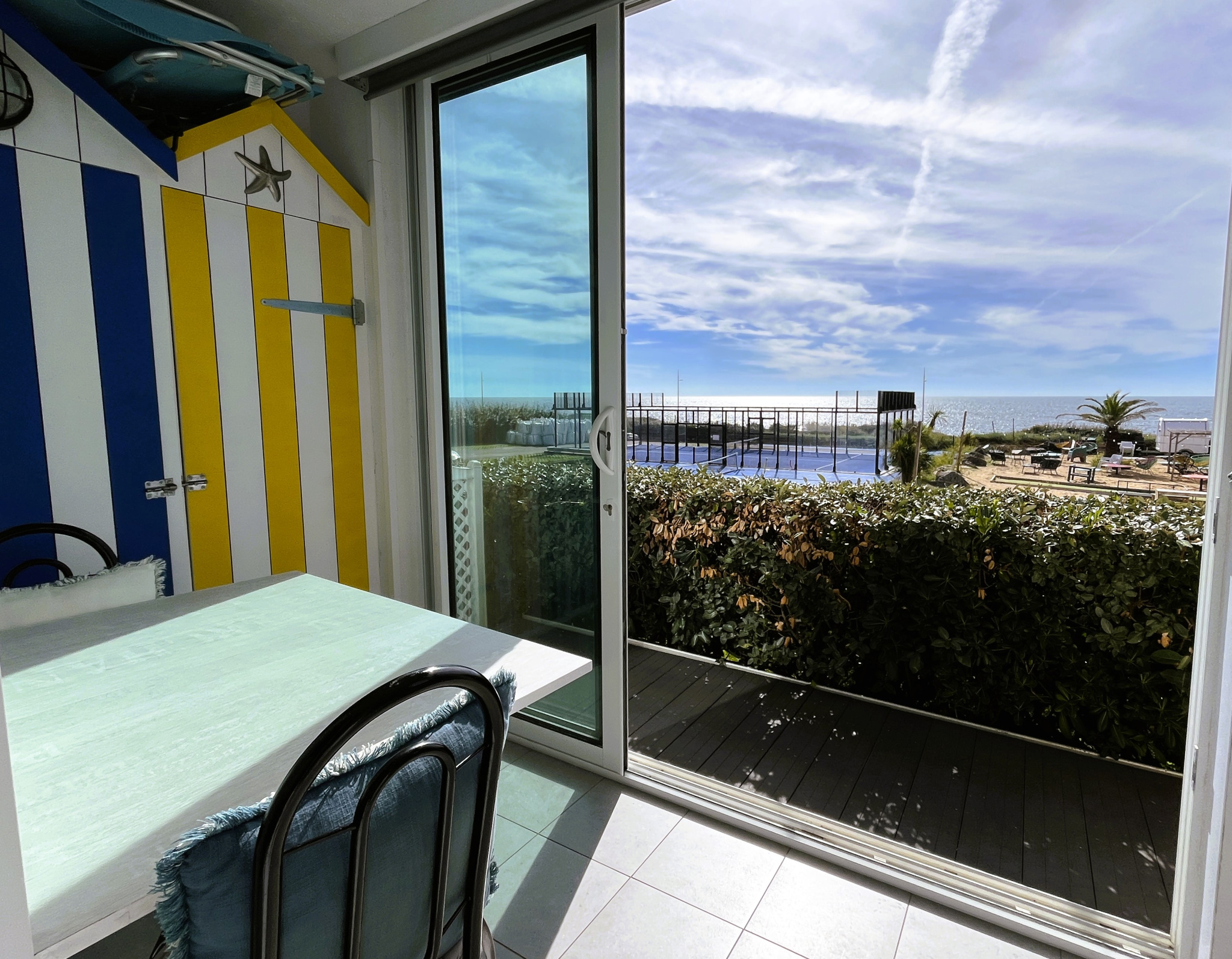 A deux pas de la plage de Tanchet et des commerces du quartier des Présidents, appartement avec vue latérale mer offrant entrée avec couchageS pour deux personnes, salle d'eau avec wc, séjour avec coin cuisine, balcon avec vue latéreale mer.