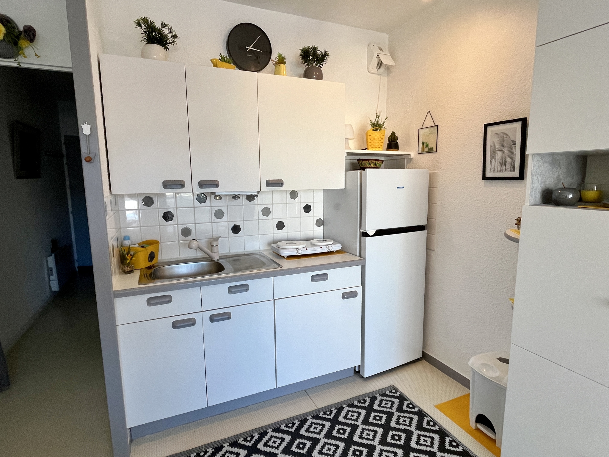A deux pas de la plage de Tanchet et des commerces du quartier des Présidents, appartement avec vue latérale mer offrant entrée avec couchageS pour deux personnes, salle d'eau avec wc, séjour avec coin cuisine, balcon avec vue latéreale mer.
