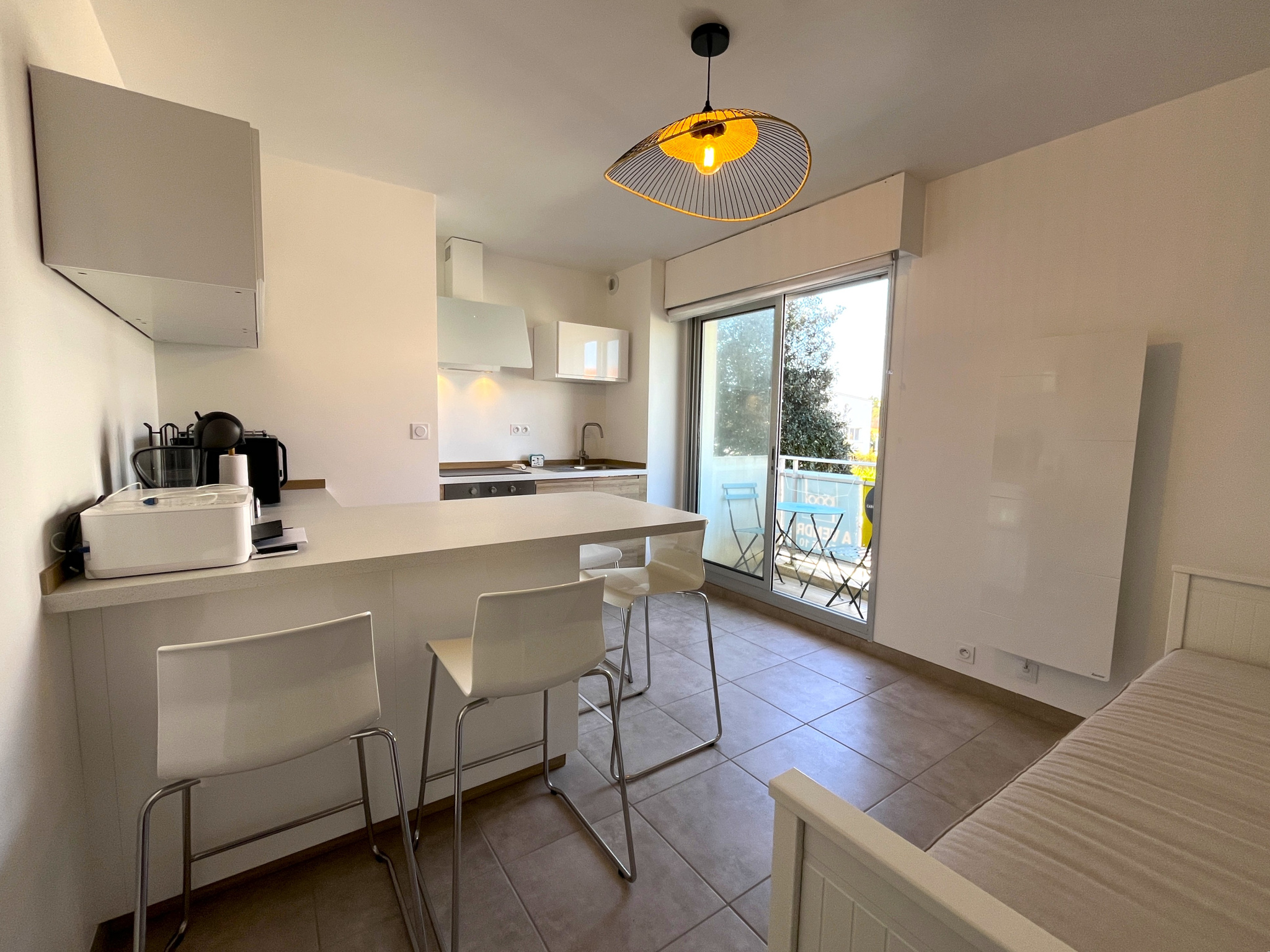 Au 1er étage d'un petit immeuble situé à deux pas de la plage et des commerces du quartier des Présidents, appartement en parfait état rénové avec goût en 2023 offrant une pièce de vie avec cuisine aménagée et équipée, grande chambre, salle d'eau ave...