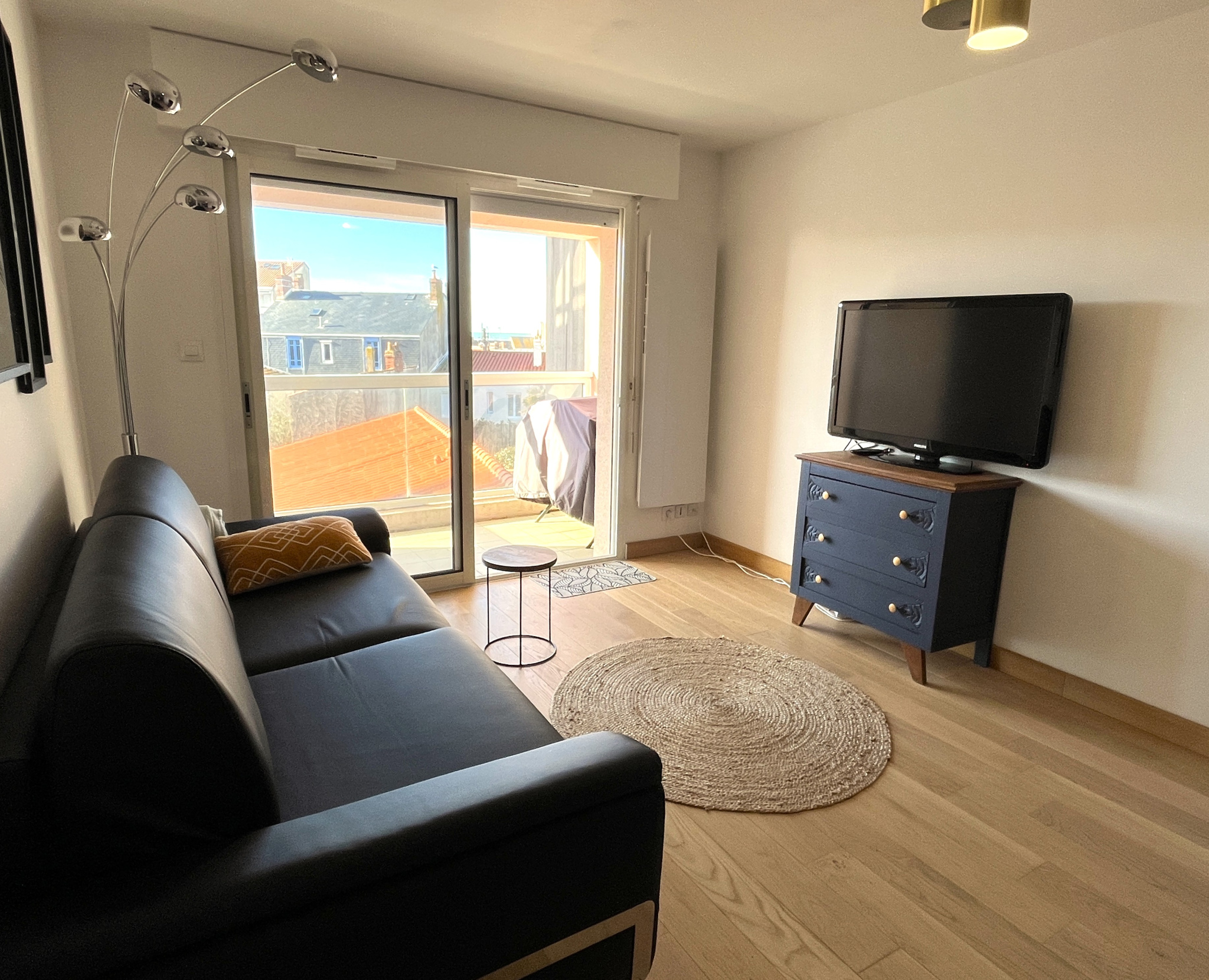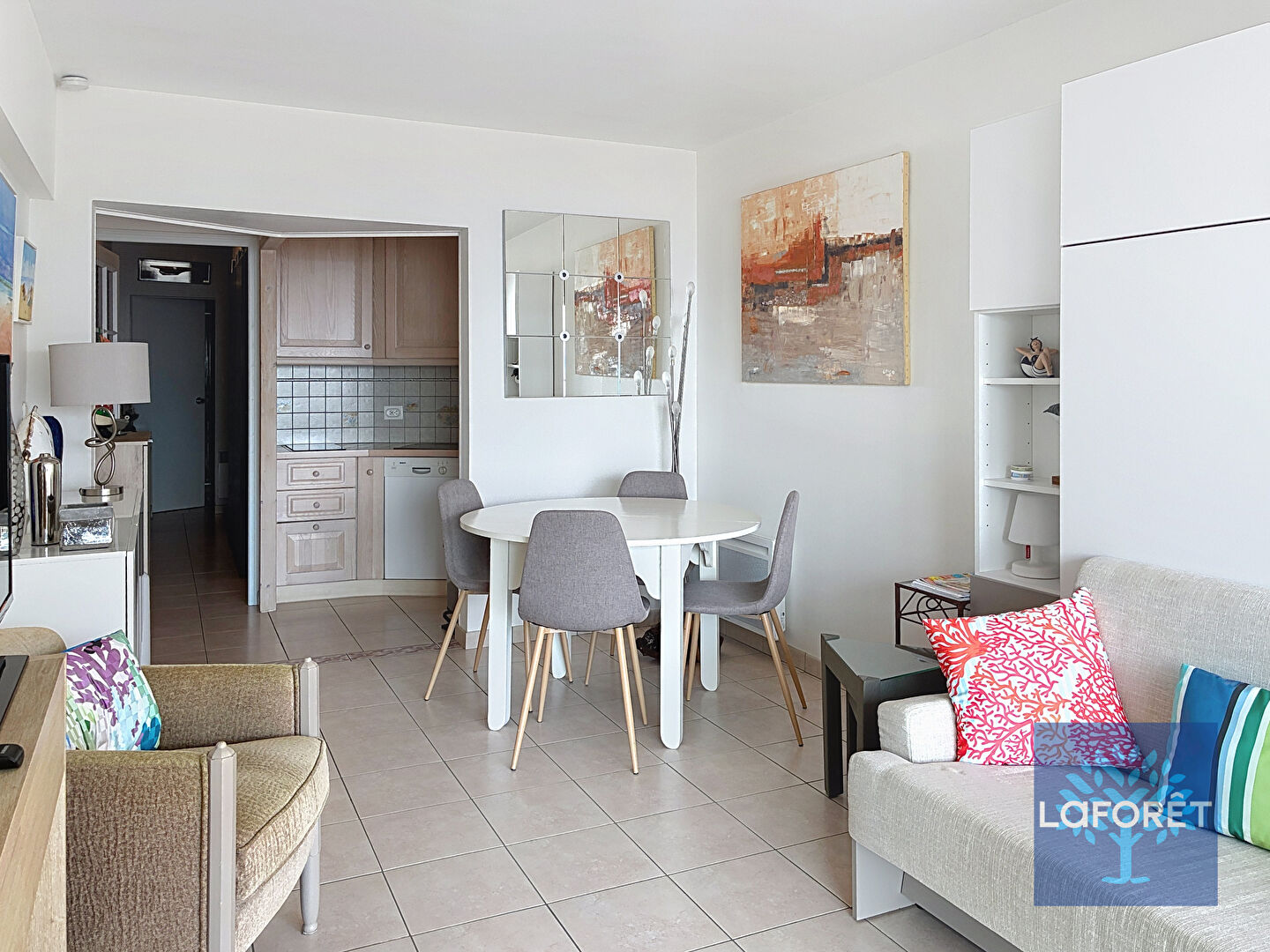Appartement T2, proche des commerces et de la plage centrale, comprenant une entrée, un séjour-cuisine, une chambre avec placard, une salle d'eau avec WC, et un balcon.
