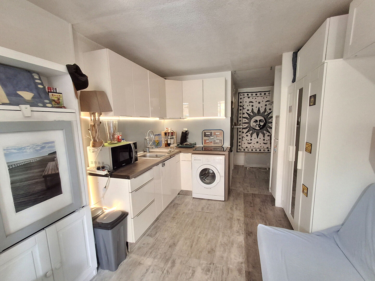 Vue Mer directe pour ce studio avec loggia en parfait état : Belle pièce de vie avec cuisine équipée qui donne sur la loggia.