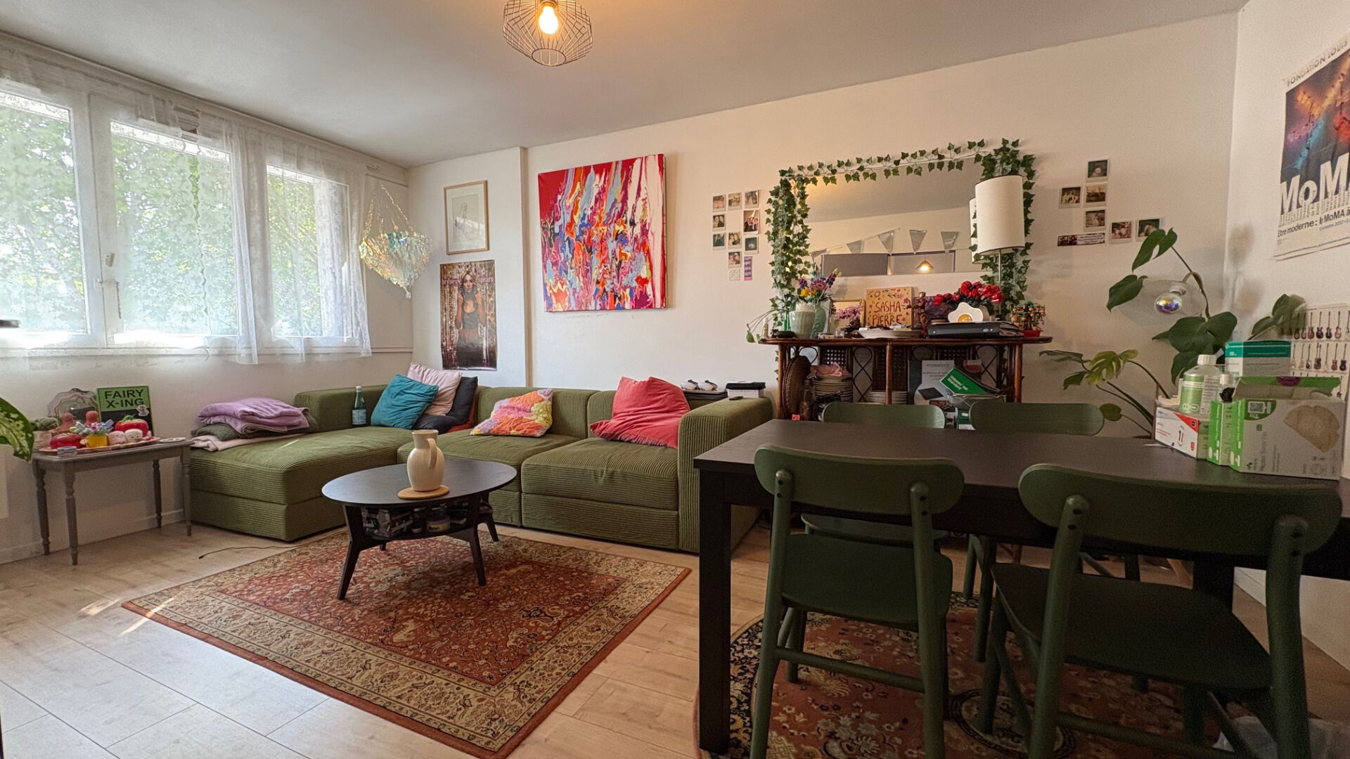 Un séjour parquet chevron, lumineux, un espace cuisine et une salle de bain à rafraîchir, wc séparé.
