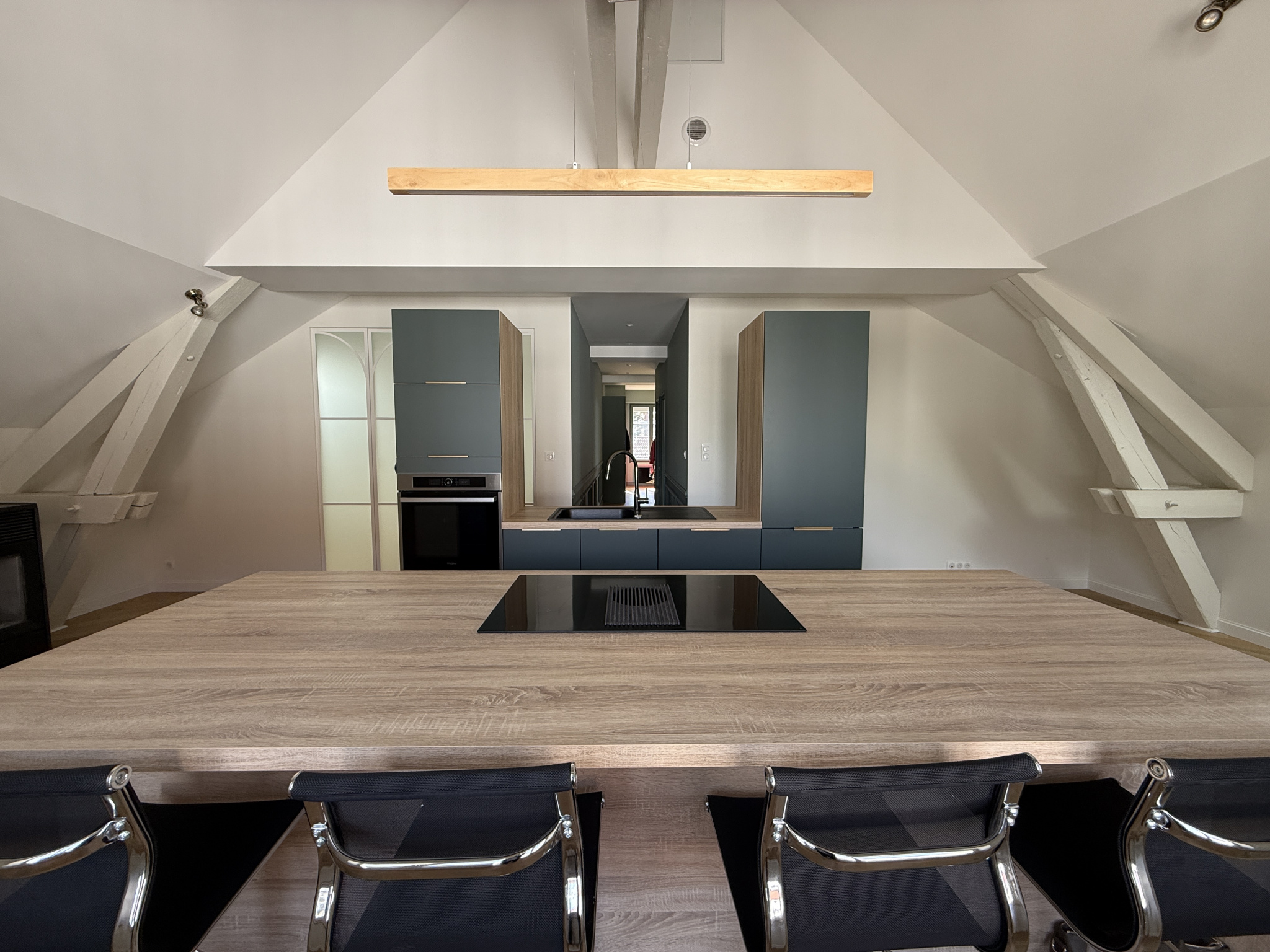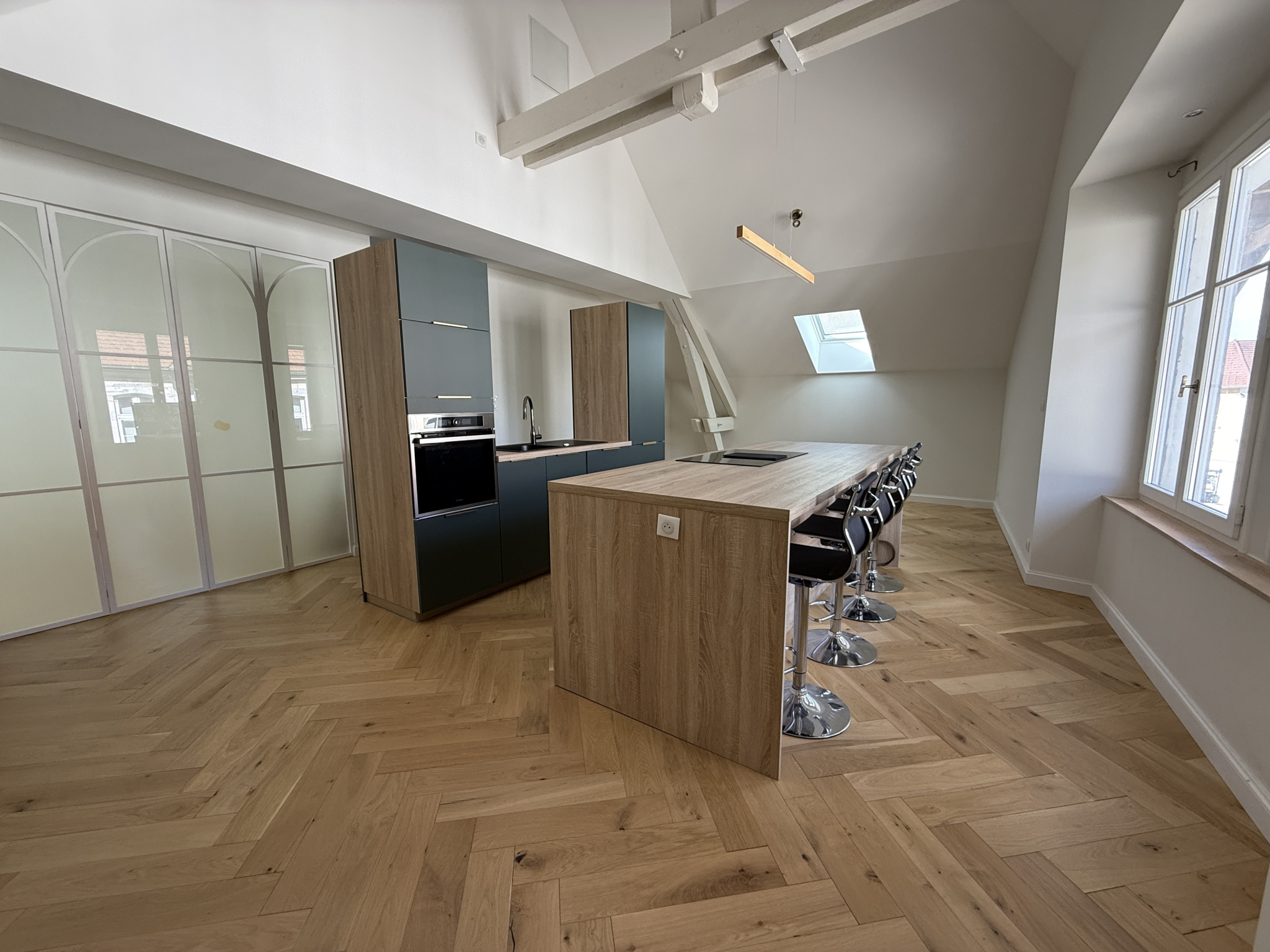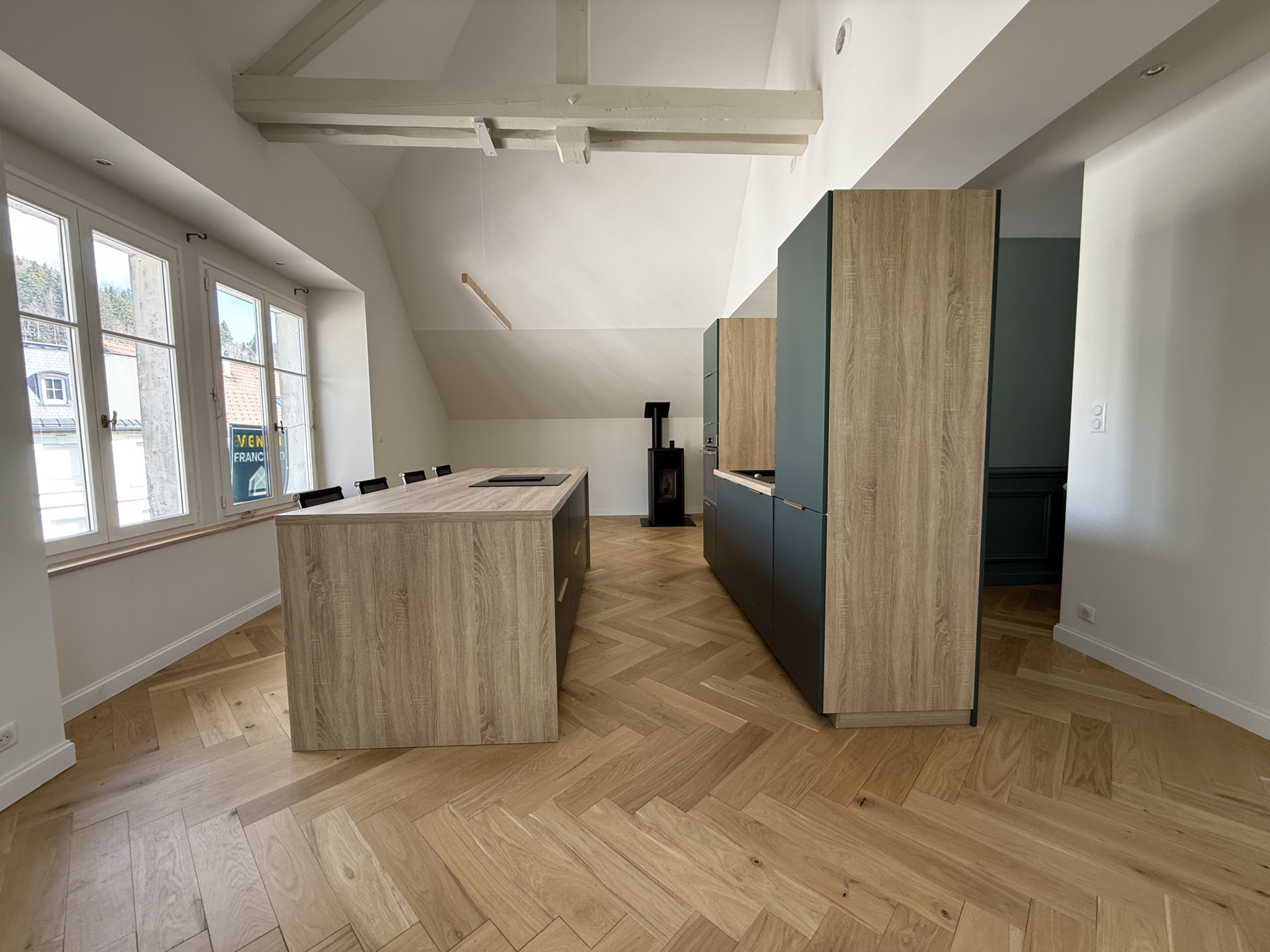 En plein coeur du centre de Maîche, aux deux derniers étages d'une petite copropriété dont il est le seul lot d'habitation, ce grand appartement est conçu de la manière suivante.