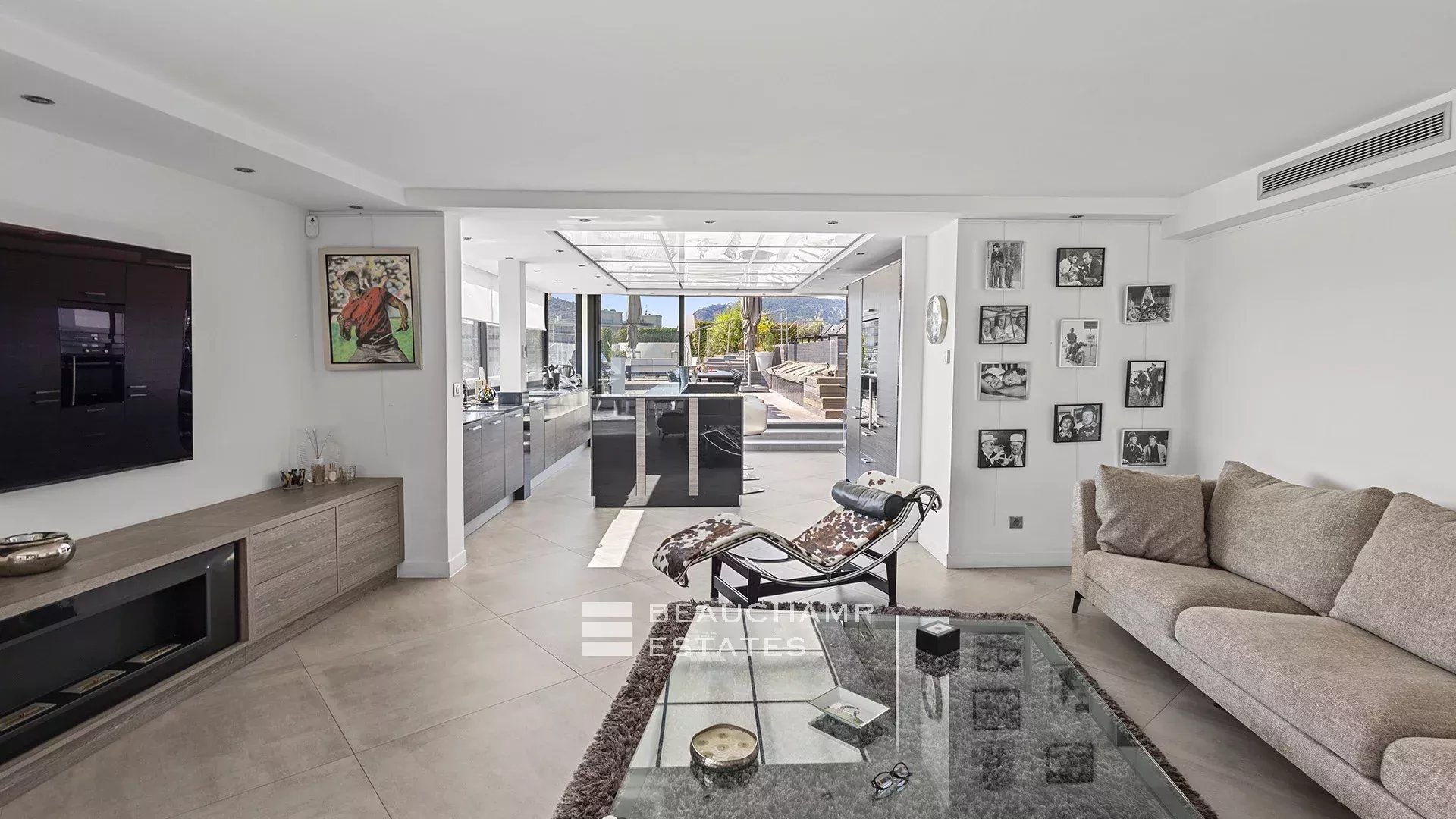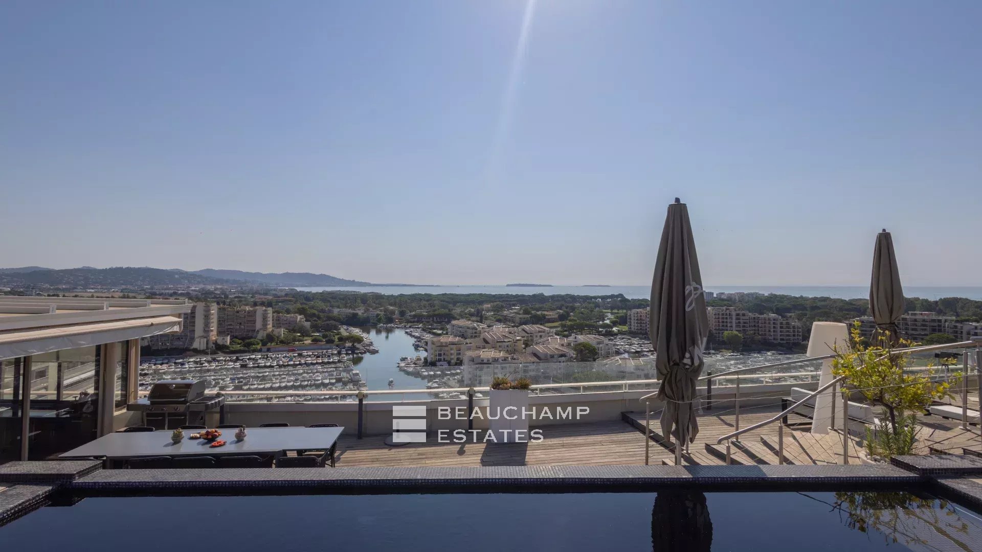 Penthouse sur le toit d’environ 175 m², offrant une vue panoramique sur la mer, le golf et le massif de l’Esterel.