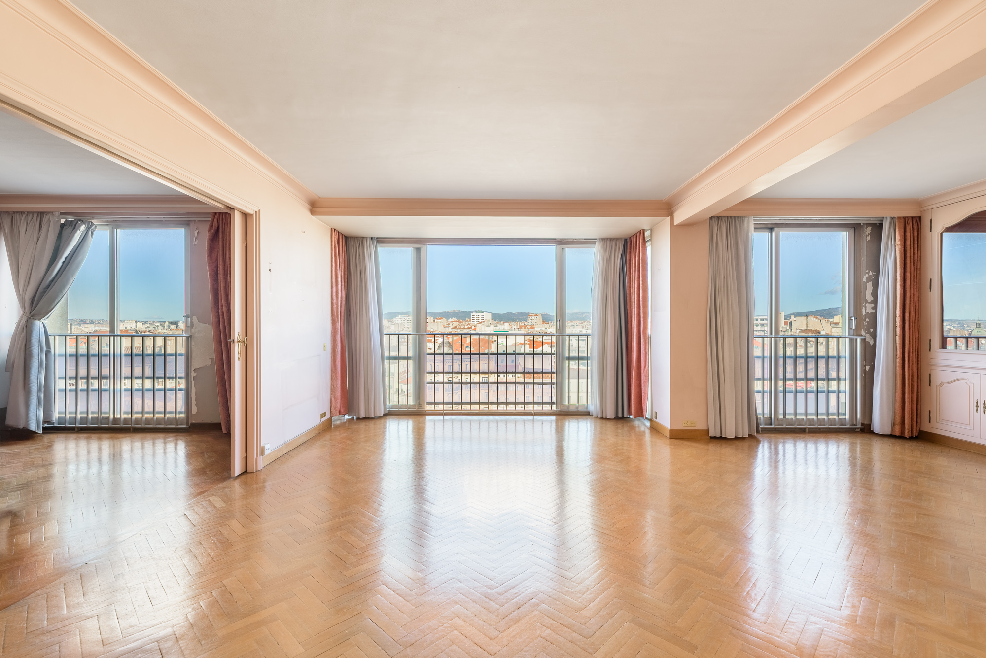 Nouveauté - Marseille 13006 - Place Castellane, au huitième étage de l'immeuble emblématique L'Eldorado, à vendre bel appartement familial de 202 m2 Loi Carrez avec terrasses et place de parking. Ce T7 traversant Est - Ouest se compose d'un agré...