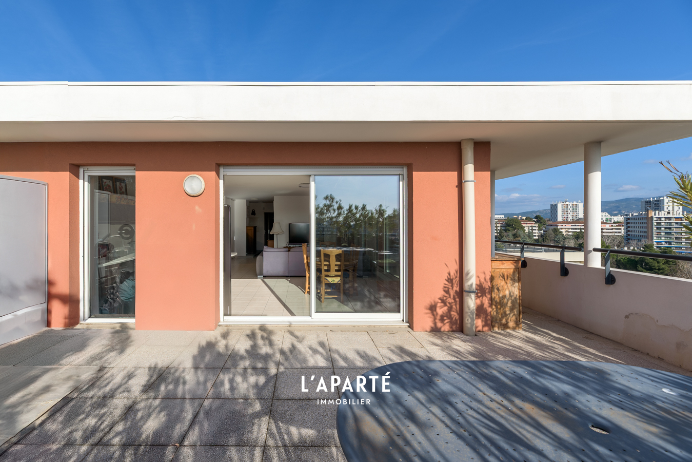 L'aparté vous invite aujourd'hui à découvrir cet appartement T4 de 90m² avec terrasse de 40m2, situé au 4ème et dernier étage d'un immeuble récent, à deux pas du village de Saint Jérôme.