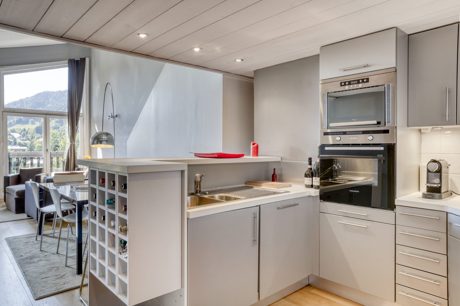 MEGEVE CENTRE, CHARMANT DEUX-PIECES REF. 7746, au troisième étage (avec ascenseur) d'une résidence établie sur la place de l'église. Séjour avec cuisine ouverte et équipée, lumineux grâce à sa situation en étage élevé et une baie vitrée s'ouvran...