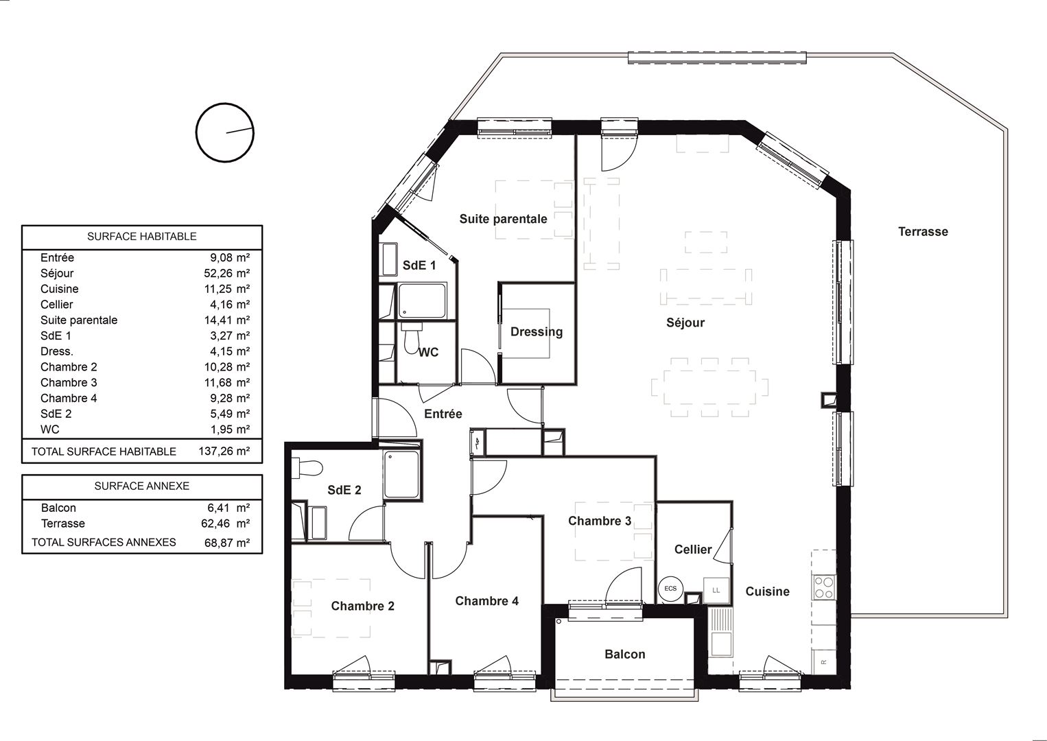 Bel appartement T5 neuf, de 148 m², ouvrant sur une terrasse au Sud de 96 m², au dernier étage d?un bâtiment de 15 logements. Il se compose d?un séjour-cuisine de 55 m², de quatre belles chambres dont deux avec salle d?eau et d?une salle de bains. Conforme à l...