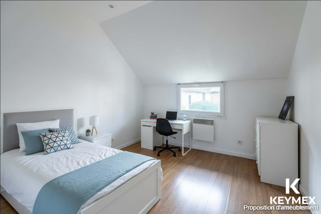 Entrée donnant sur un séjour avec cuisine ouverte, une chambre, un bureau pouvant servir d'espace de télétravail ainsi qu'une salle d'eau avec WC.