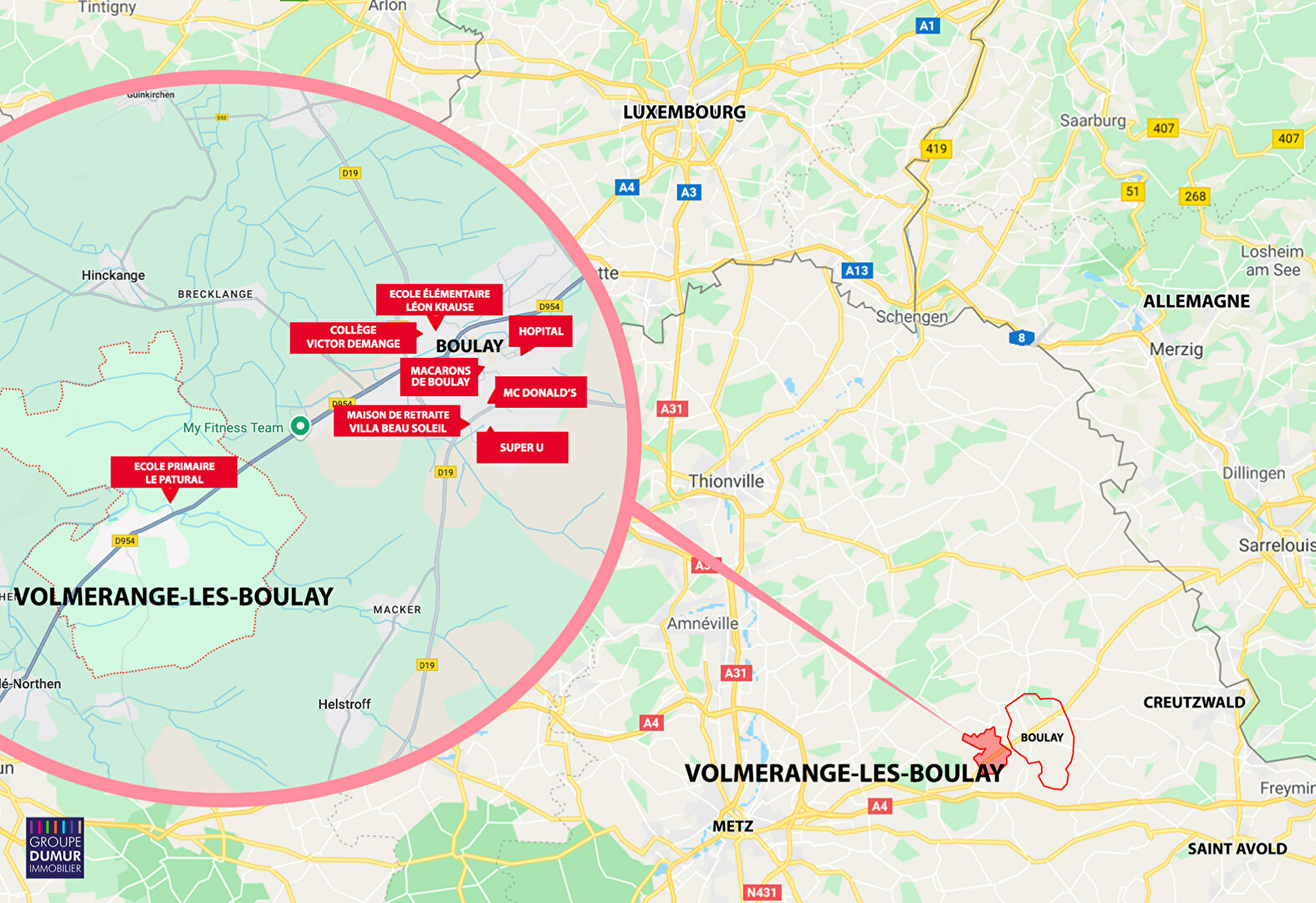 VOLMERANGE LES BOULAY : Dans ce village paisible à 30mn de Metz et 5 mn de Boulay où vous trouverez de nombreux commerces, écoles et un accès rapide aux autoroutes.