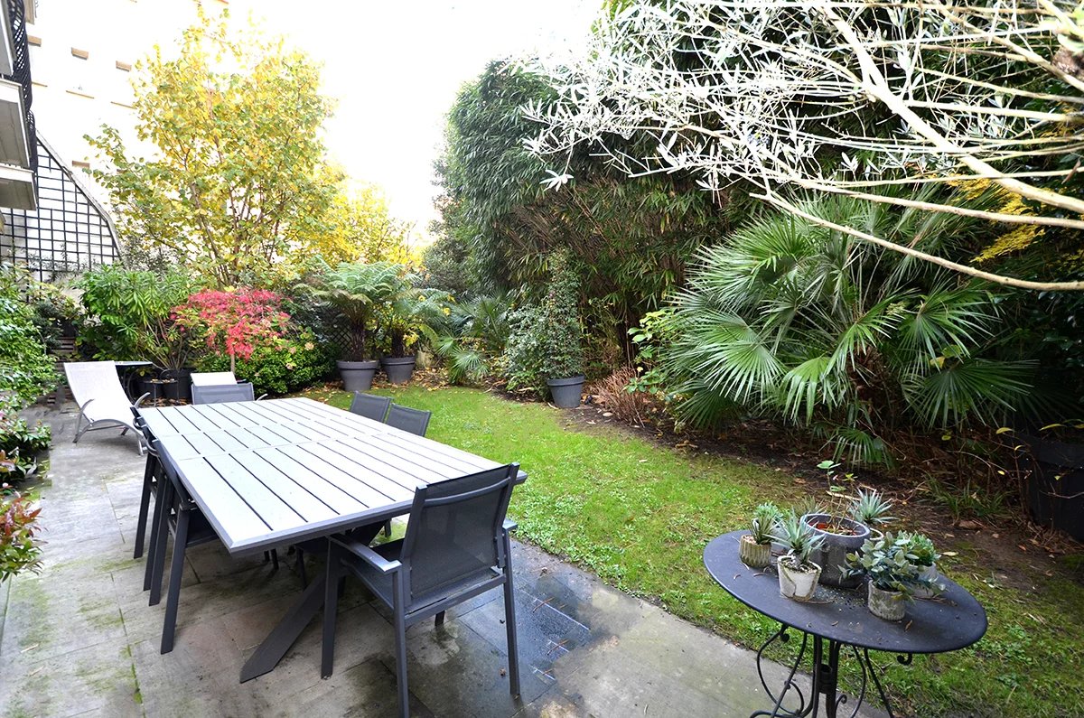 Neuilly Saint James. Magnifique rez-de-jardins de 110m² comprenant une entrée, un grand séjour de 47m² ouvrant sur jardins de 200m², une chambre de maître de 18m² ouvrant sur jardins, une chambre aménagée en dressing, une cuisine aménagée équipée, une salle de...